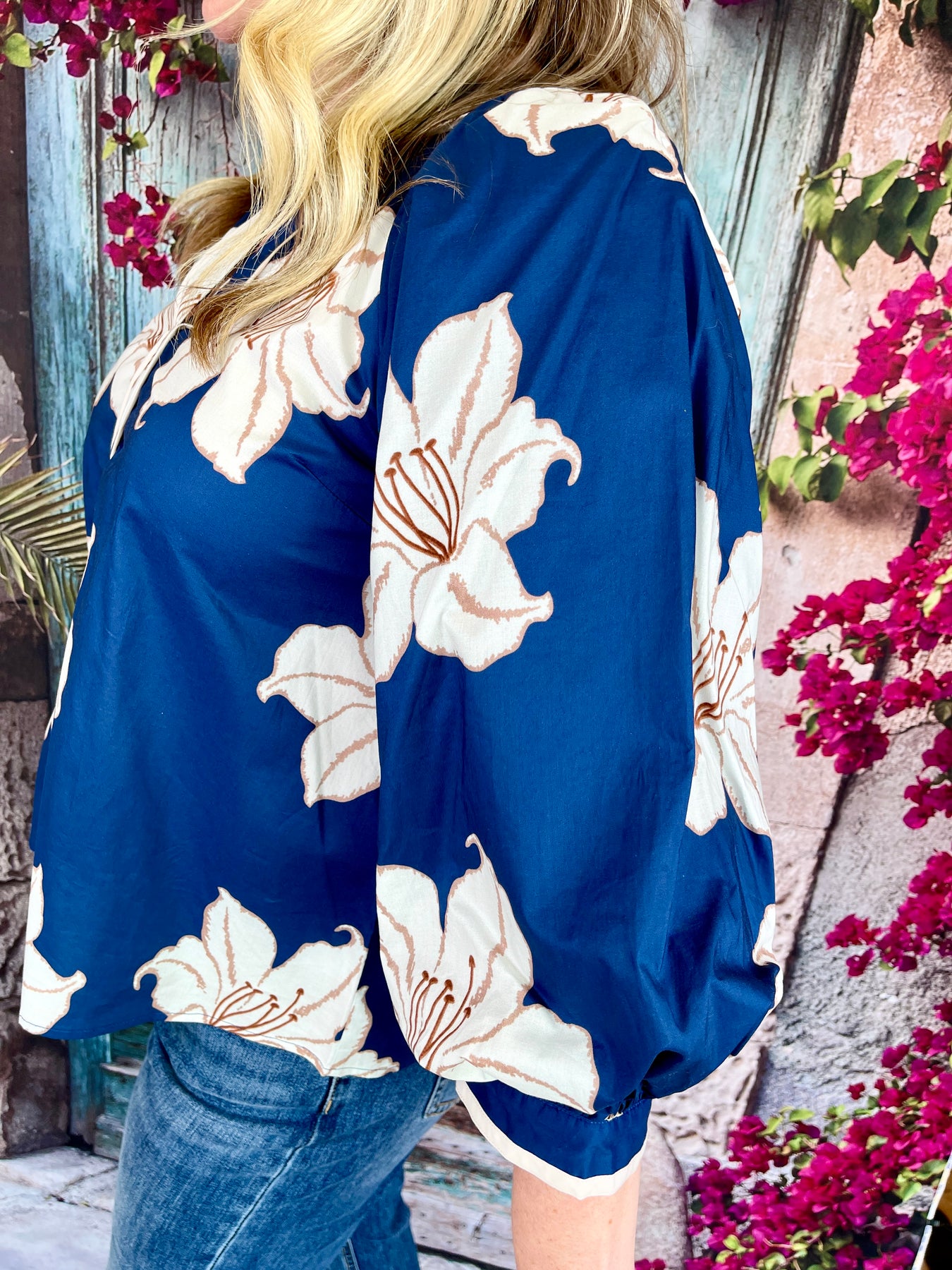 Chic and charming, the Autumn’s Blooms Top – Navy brings a touch of timeless beauty to your fall wardrobe! This long sleeve navy blouse features a delicate white floral print and a subtle V-neckline for a flattering, feminine touch. The neckline and sleeve hems are finished with a coordinating navy and white band, adding a polished pop of contrast. Fully lined and beautifully detailed, it’s the perfect top for dressing up denim or pairing with tailored pants for an effortlessly pretty look.