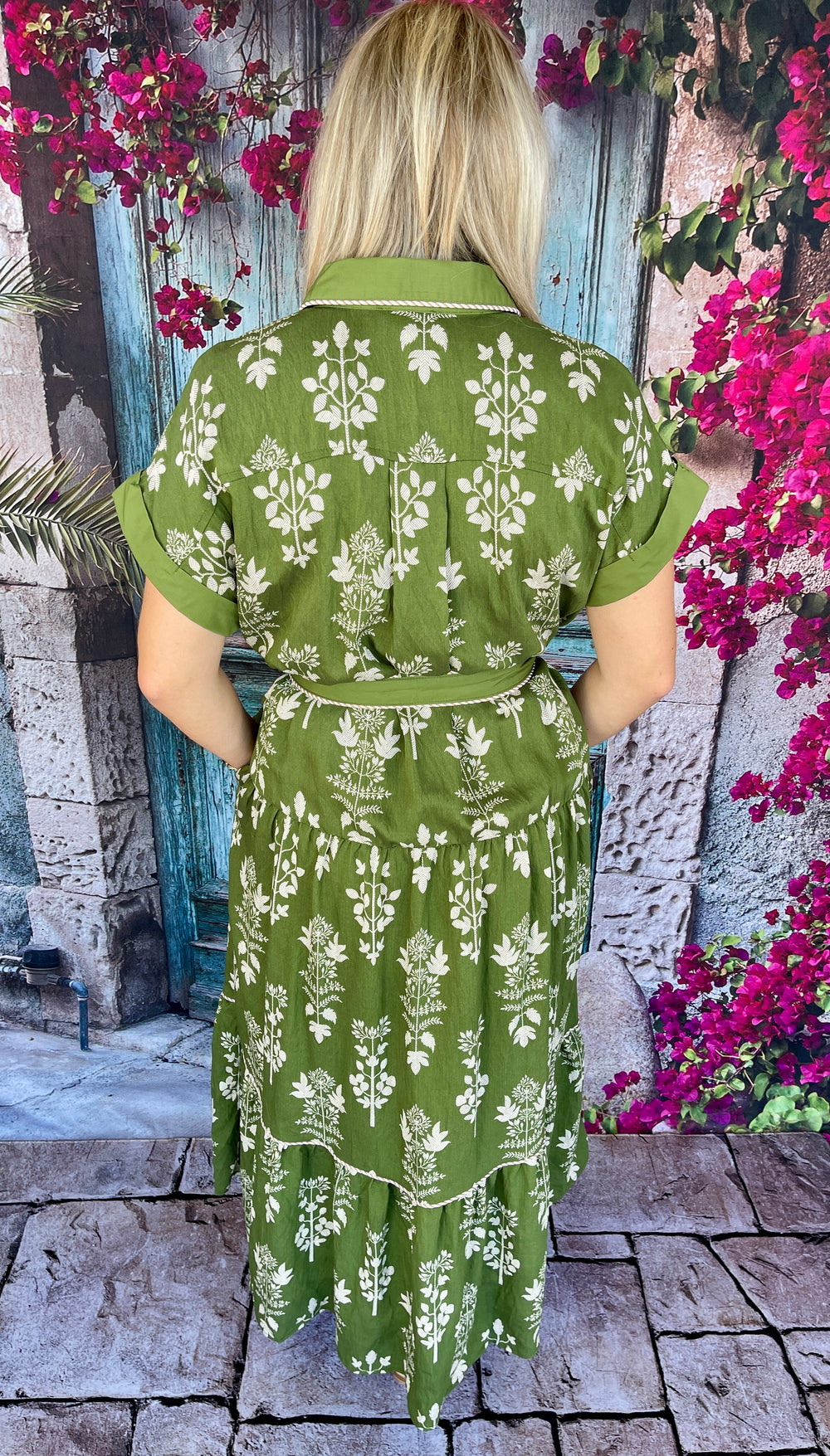Chic and versatile, the Emma Belle Dress is a timeless favorite for every season! This olive midi features a botanical pattern with striped accent piping for a pop of detail, plus a collared button-front closure for a polished finish. The removable belt cinches the waist for a flattering fit, while faux roll-up sleeves and side pockets add functional charm. Lightweight and lined, it’s perfect for workdays, weekends, or special outings.
