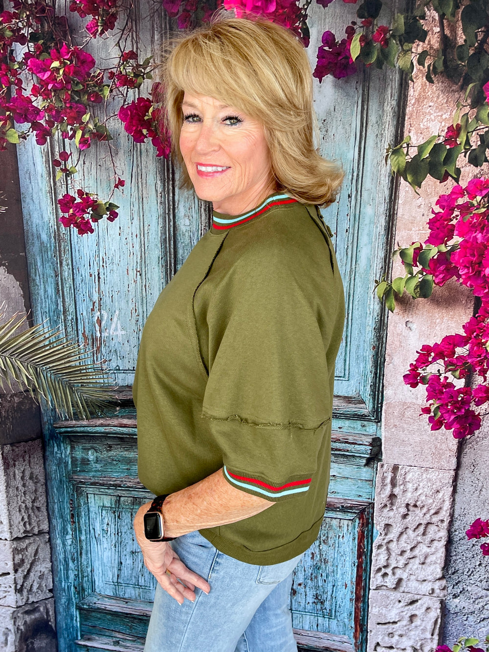 Comfort meets playful detail in the Comfy All The Way Top! This olive pullover features solid elbow-length raglan sleeves and a relaxed silhouette accented with a multicolor band for a fun, stylish touch. Lightweight and breathable in 100% cotton, it’s perfect for casual days while still looking put together.