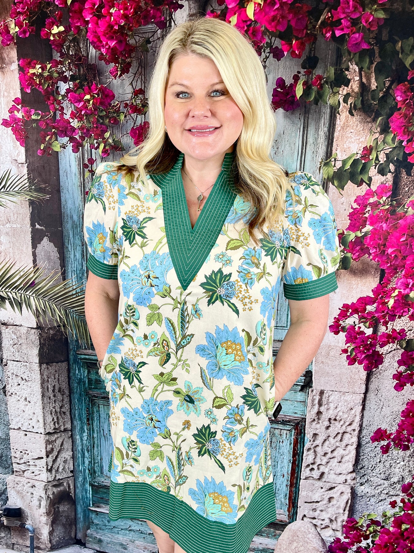 Fresh, floral, and effortlessly chic — the Piper Dress is the perfect blend of charm and comfort! This beautiful cotton dress features a floral print in soft green and blue tones, giving it a breezy, feminine feel. The dark green textured trim along the neckline, sleeve hems, and bottom hem adds a lovely contrast and touch of detail. Lightweight and easy to wear, it’s the perfect pick for casual outings, brunch dates, or sunny fall days!