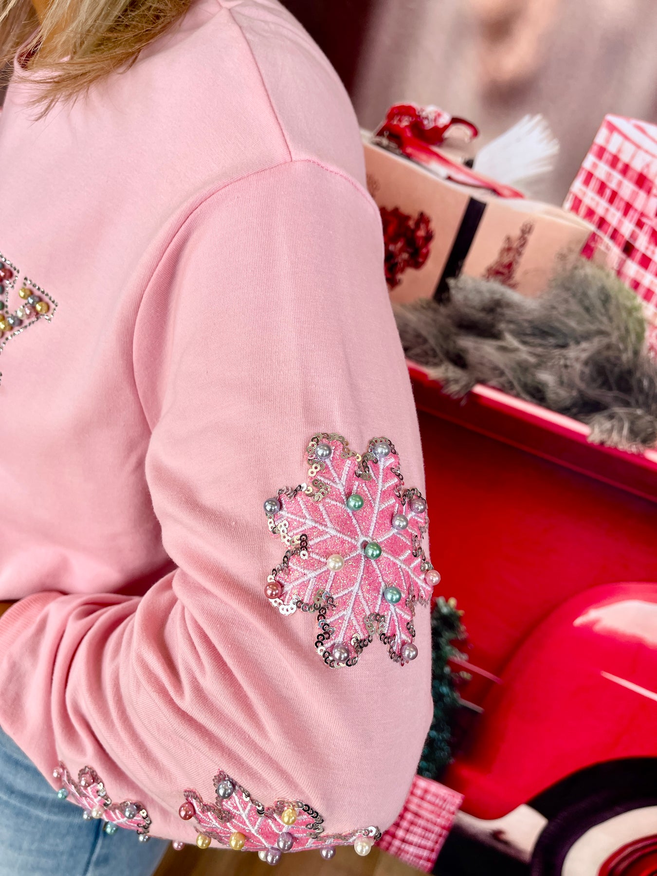 Festive, fun, and oh-so-sparkly — the Merry Top is here to make your holiday season shine! This soft pink sweatshirt features the word “merry” across the front, embellished with pink, teal, yellow, and white beaded detailing. A border of tiny silver gems adds an extra touch of shimmer. The sleeves are adorned with glittery pink snowflakes accented with coordinating beads and finished with silver sequin trim — perfectly playful and full of cheer!