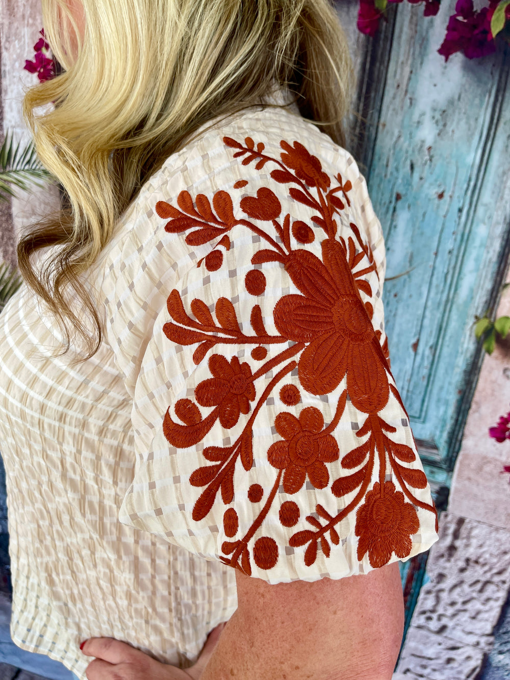 Feel effortlessly confident and beautifully bold in the Havannah Top! This off white must-have features a relaxed fit, soft lightweight fabric with a subtle checkered texture, and gorgeous burnt orange embroidery on the sleeves. Perfect for game day glam or everyday style, it’s an easy favorite you'll reach for all season long.