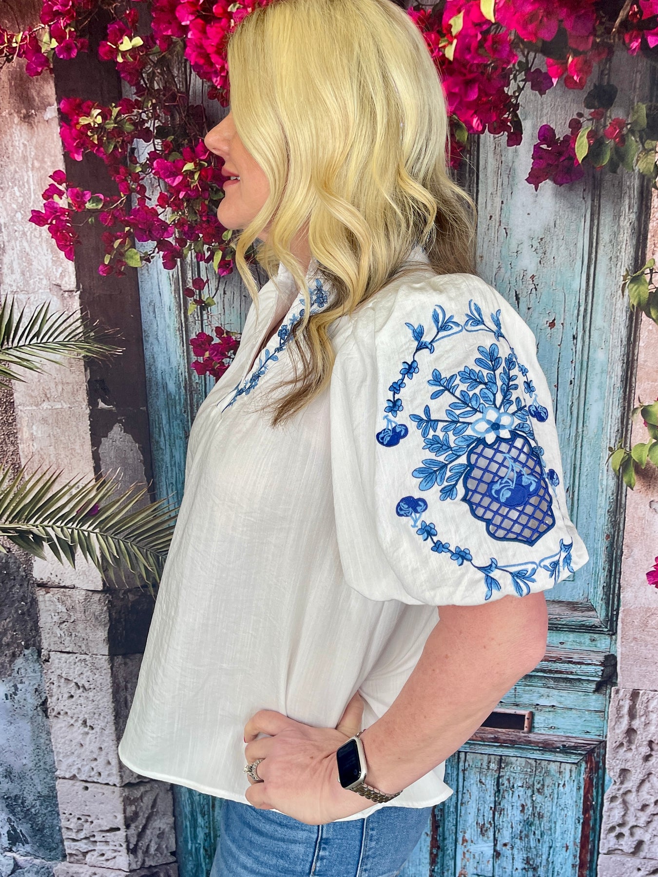 Sweet, charming, and beautifully detailed—the Blueberry Baby Top is a delightful short sleeve white puff sleeve top that brings fresh, garden-inspired style to your wardrobe! This gorgeous top features a crisp white base that's versatile and timeless, perfect for any season or occasion. The short puff sleeves, flattering V-neckline, and collar are all beautifully adorned with a charming blue floral design, adding a sweet, romantic accent that sets this piece apart. The puff sleeves add a feminine, vintage-inspired touch that completes the silhouette. Crafted from a luxurious rayon-polyester-nylon blend, this top feels soft, drapes beautifully, and is comfortable for all-day wear. Pair it with jeans for a casual chic look or tuck it into a skirt or trousers for a more polished ensemble that's perfect for work, brunch, or special occasions!