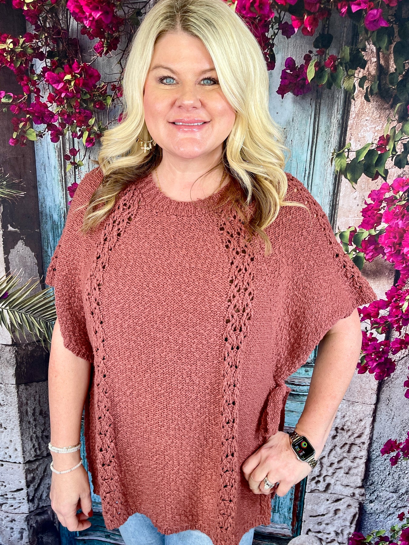 The Good Ole Days Top in red bean is a timeless crochet favorite with charming details that set it apart. This short sleeve mock-sleeve top features two thicker textured crochet stripes down the front for a touch of vintage-inspired design. On the side, a small tie strap allows you to cinch and tie it into a dainty bow for an effortlessly feminine finish.
