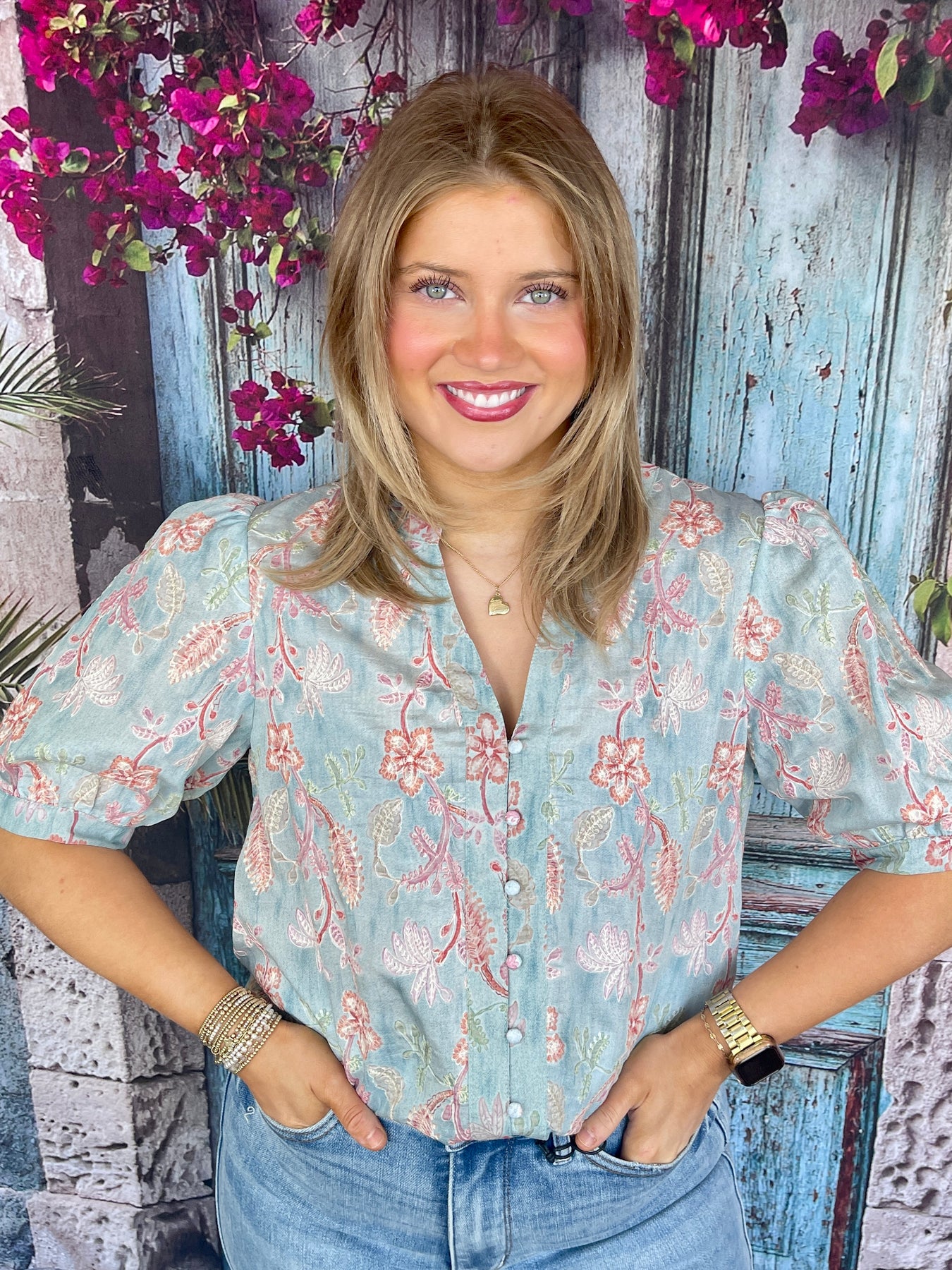 Charming, vibrant, and beautifully detailed—the Ruthie Top is a delightful short puff sleeve light blue top that brings garden-inspired joy to your wardrobe! This gorgeous top features a lovely light blue base adorned with a colorful floral design throughout, creating a cheerful, eye-catching pattern that's perfect for any season. The flattering V-neckline adds an elegant accent to the silhouette, while buttons on the front of the top add classic, functional detailing. The short puff sleeves add a feminine, vintage-inspired touch that completes the look. Crafted from a luxurious Tencel-cotton blend, this top feels incredibly soft, breathable, and eco-friendly, making it comfortable for all-day wear. Pair it with jeans for a casual chic look or tuck it into a skirt or trousers for a more polished ensemble that's perfect for work, brunch, or special occasions!