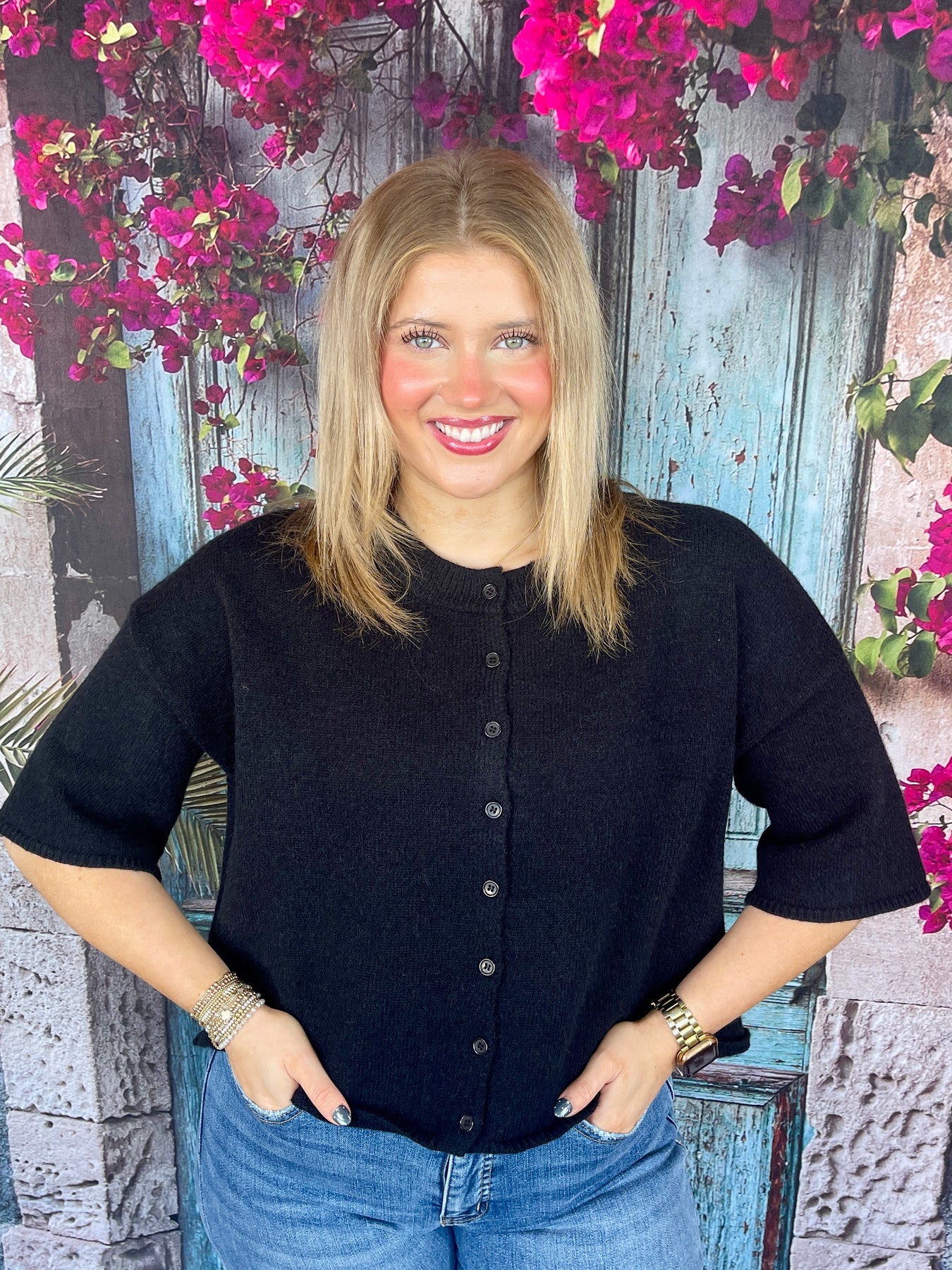 Cozy with a chic twist, the Can’t Be Cold Sweater is a must-have for transitional seasons. This soft, short sleeve black sweater features a button-down front with matching black buttons, giving it a polished yet comfy look. Perfect for layering or wearing on its own, it’s an easy piece you’ll reach for again and again.