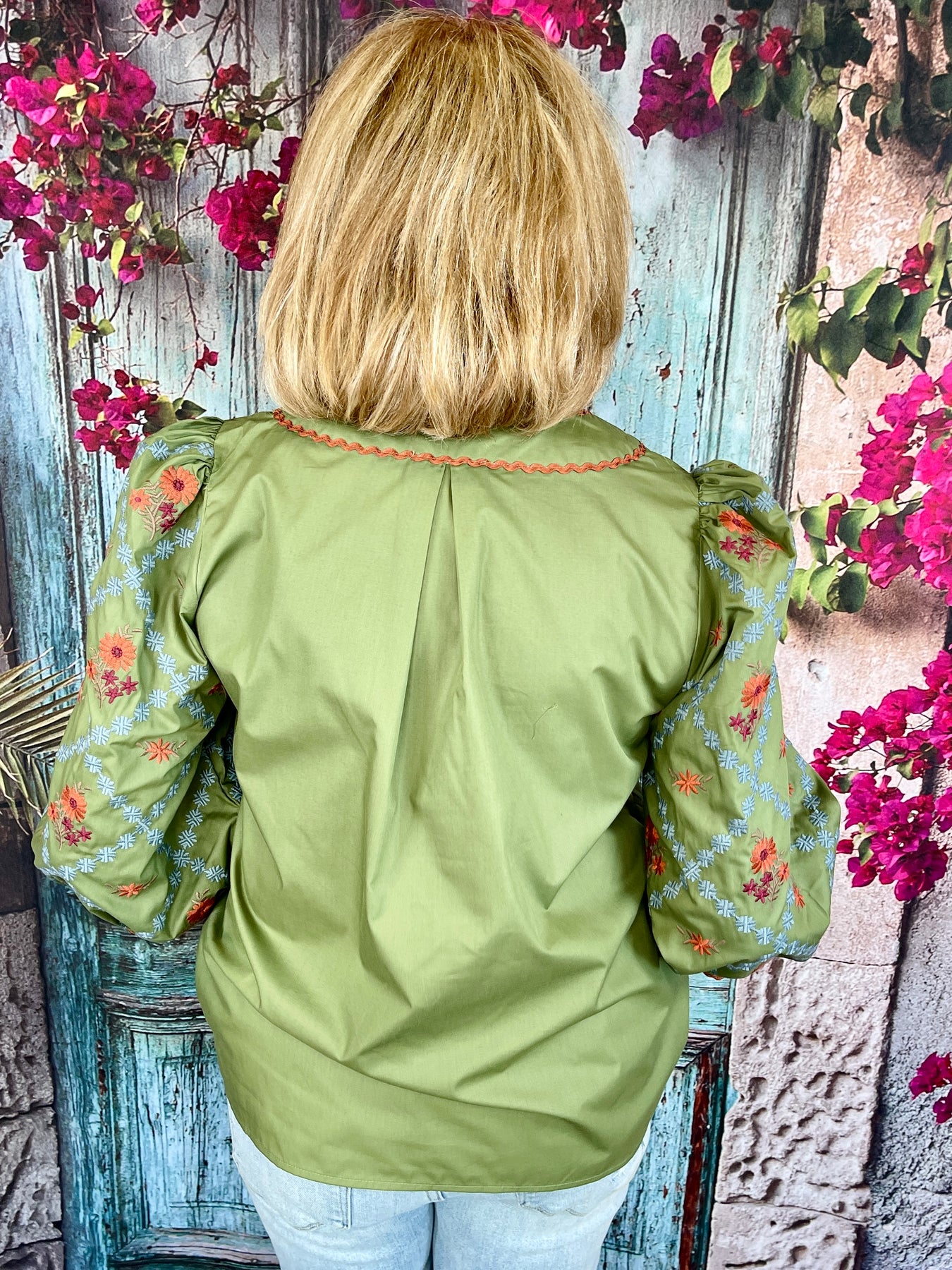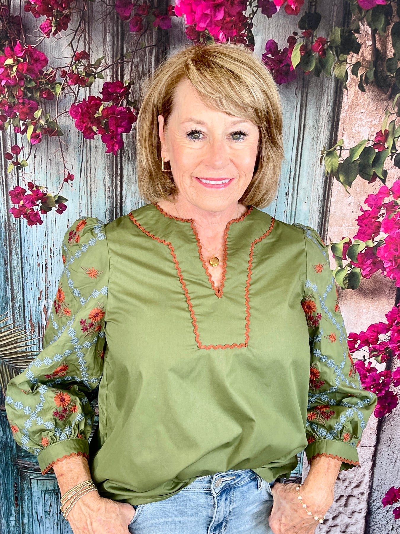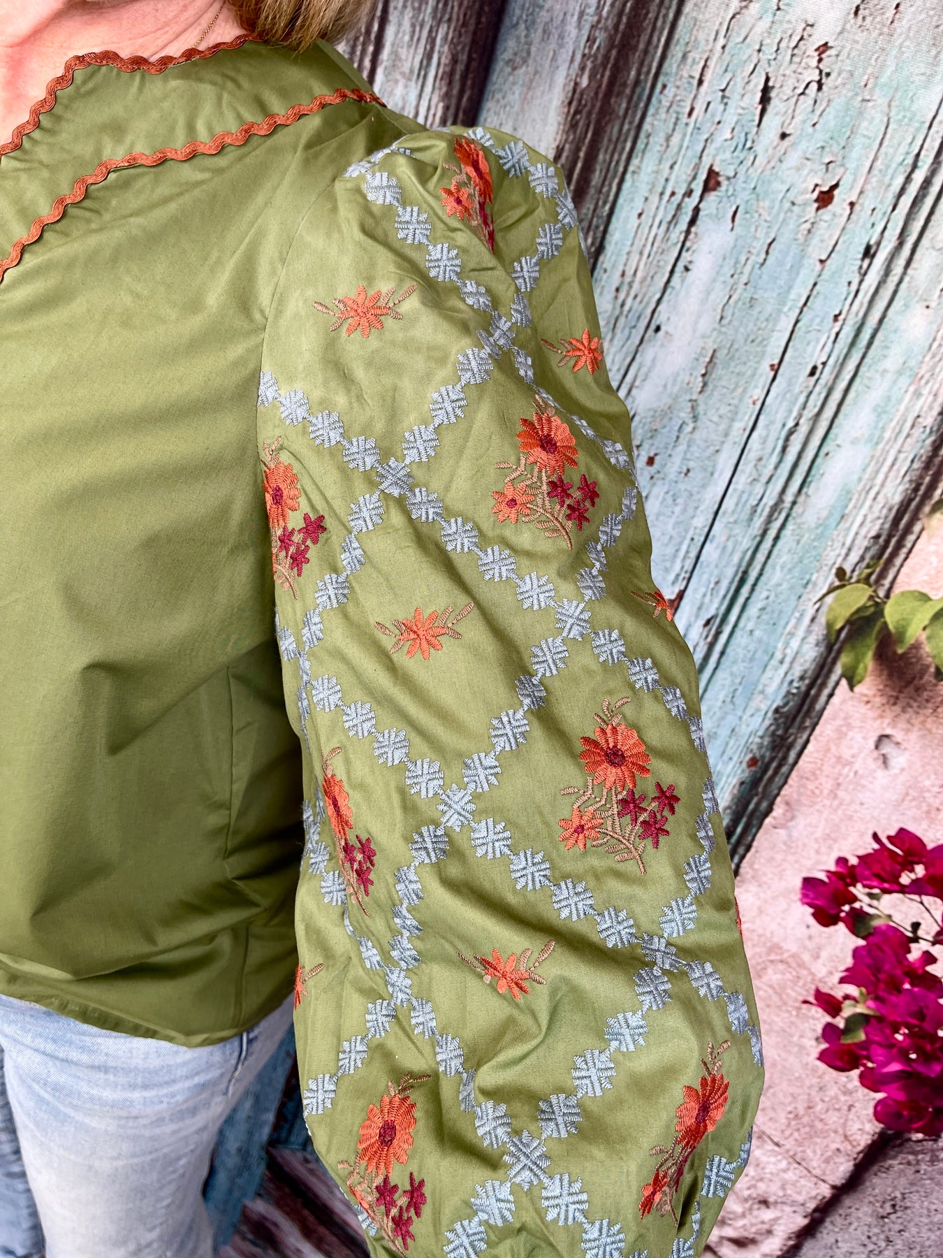 Bring cozy fall charm to your wardrobe with the Festive Spice Top — a beautifully detailed piece full of rich seasonal tones and textures. This long sleeve olive green top features a subtle blue textured grid pattern with orange, red, and brown floral accents throughout. The sleeves have a slight puff for a soft, feminine touch, while the hems are finished with an olive green band and a brown wavy stripe for added contrast. The neckline and v-neck are outlined with the same wavy brown stripe, tying the look together perfectly.