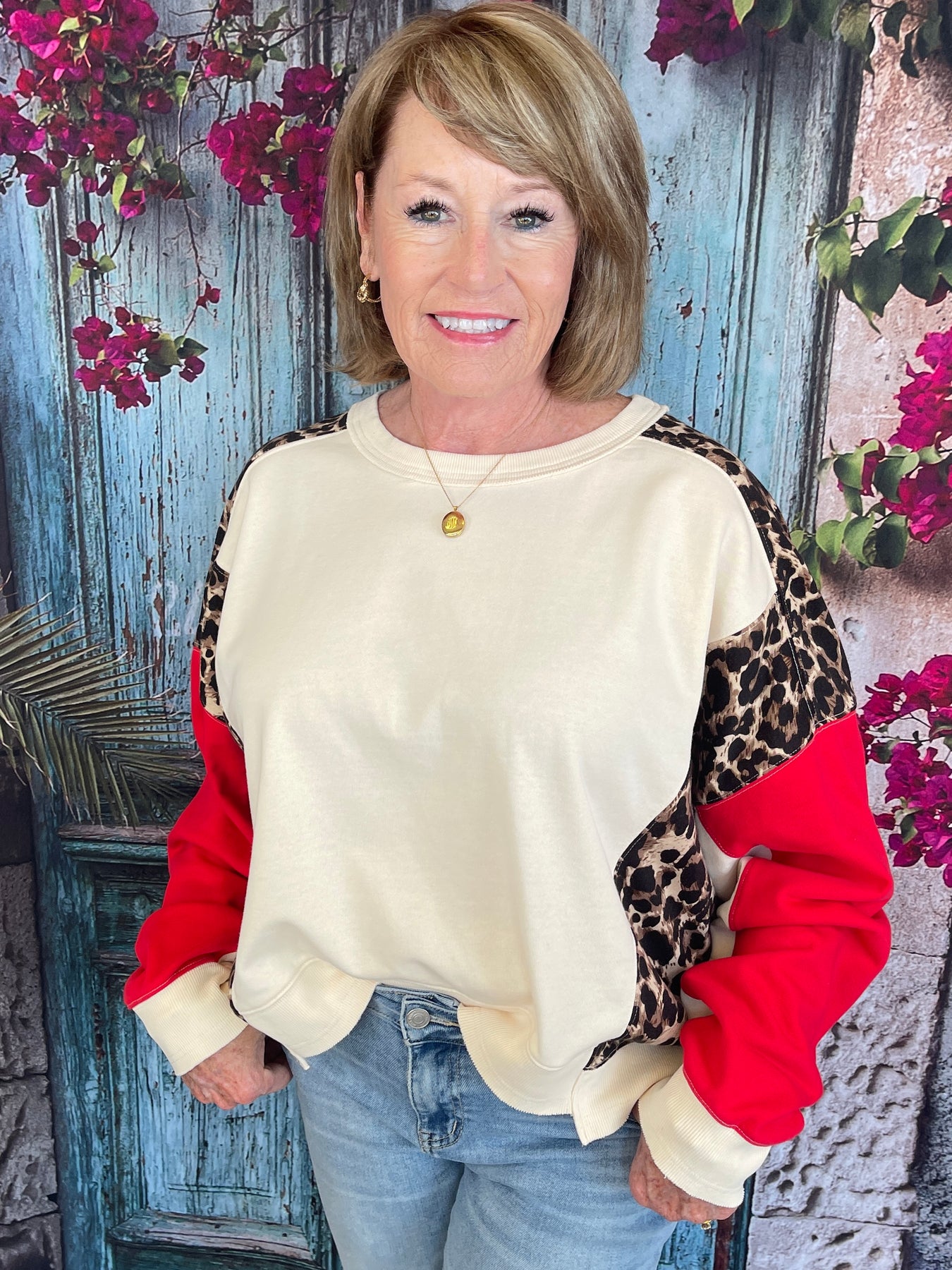 Bold, fun, and full of attitude - the Bad to the Bone Top is the perfect mix of casual comfort and wild style! This cream long sleeve top features cheetah print and red contrast panels running down the sides of the sleeves, adding a striking pop of color and pattern. Soft, cozy, and effortlessly cool —-it’s the statement top your wardrobe’s been waiting for!