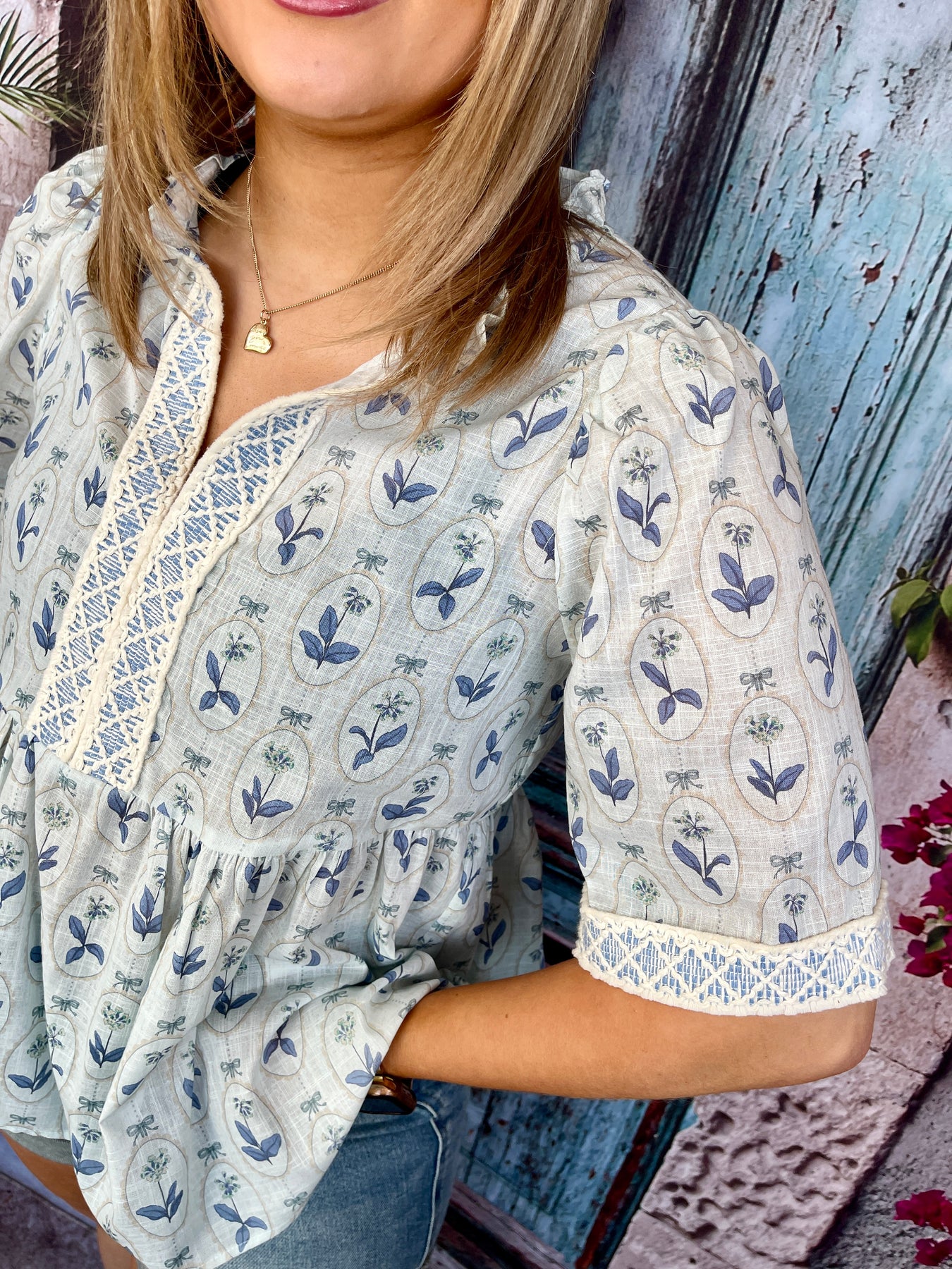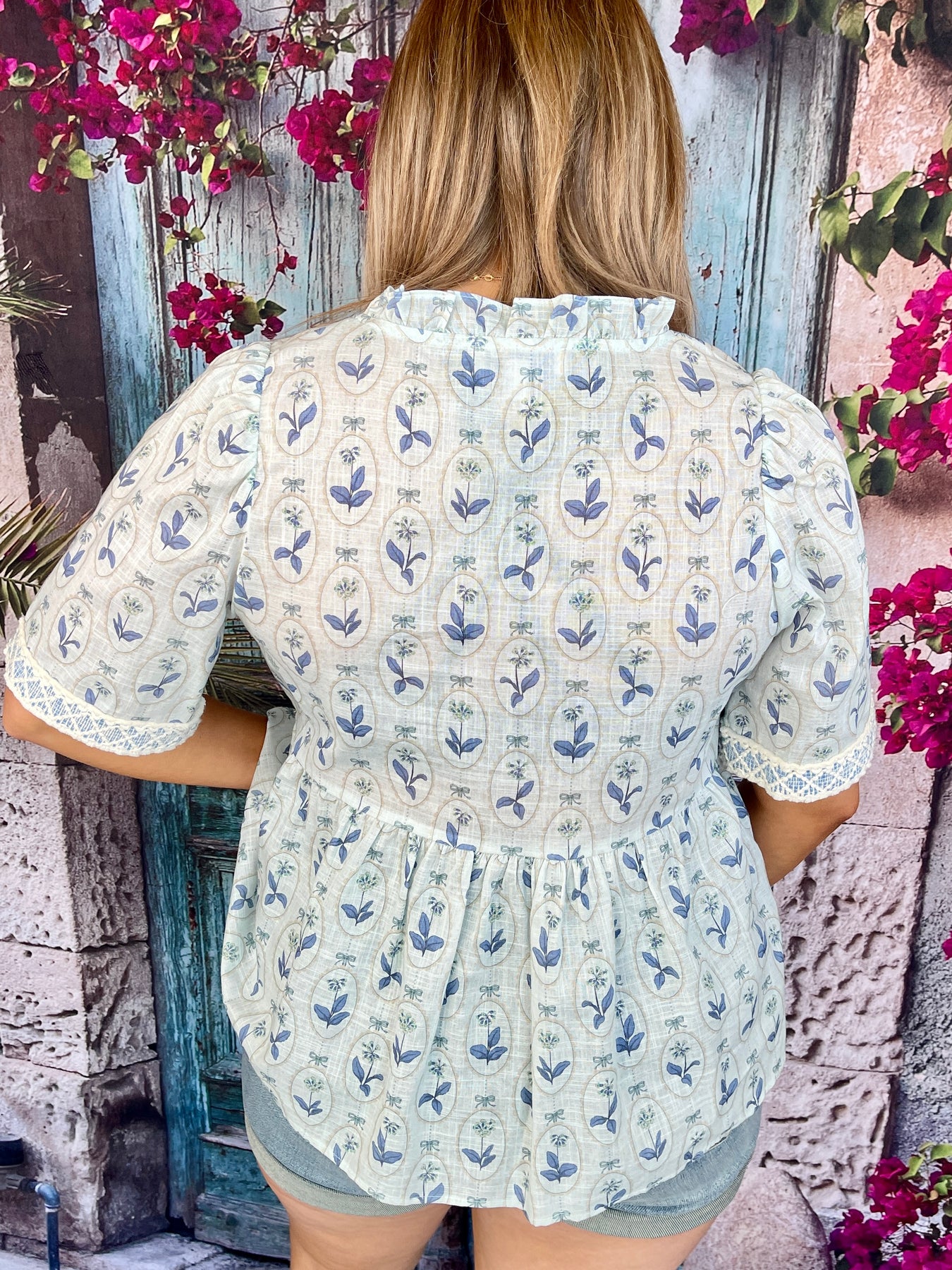 Sweet, charming, and beautifully detailed—the X's & Bows Top is a delightful short sleeve light blue top that brings whimsical, feminine style to your wardrobe! This gorgeous top features a lovely light blue base adorned with charming flowers and bows throughout, creating a playful, romantic pattern that's perfect for any season. The collar showcases a sweet little ruffle that adds a feminine touch, while the flattering V-neckline and sleeve hems are beautifully accented with a coordinating light blue and white X's textured band, adding a unique, eye-catching detail that sets this piece apart. The short sleeves make this top perfect for warm weather and easy layering. Crafted from 100% cotton with quality contrast details, this top is breathable, comfortable, and perfect for all-day wear. Pair it with jeans for a casual chic look or tuck it into a skirt or trousers for a more polished ensemble!