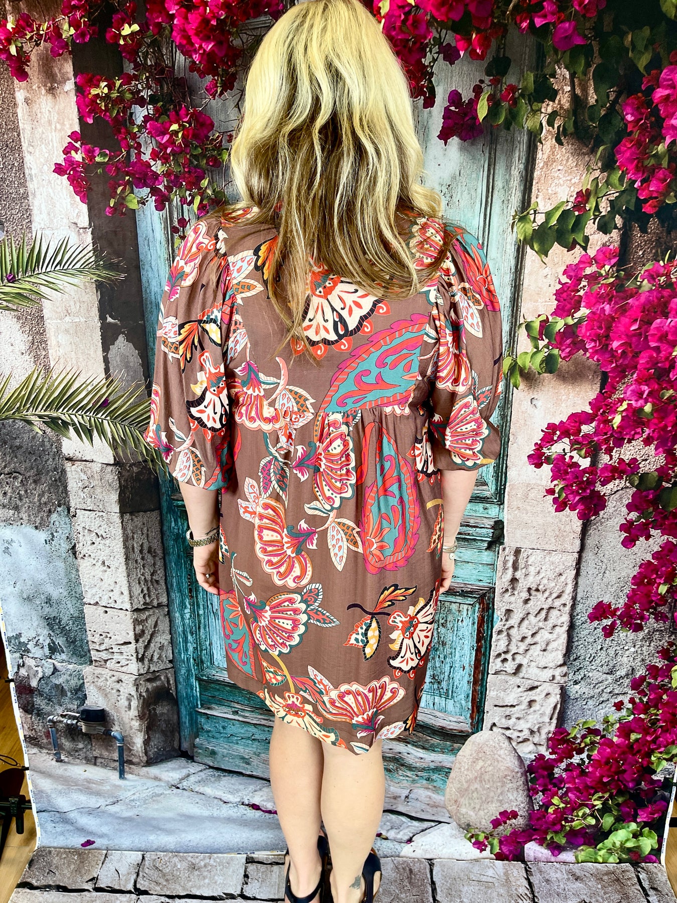 Fall in love with the effortless charm of the Becky Brownie Dress – Brown! This abstract paisley mini dress showcases a rich mix of rust, neutral, and teal hues — the perfect palette for the season. The ruffled neckline adds a soft, feminine detail, while the lightweight woven fabric keeps it breezy and comfortable. With its relaxed, generous fit and no lining, it’s an easy choice for everything from lunch dates to fall festivals.