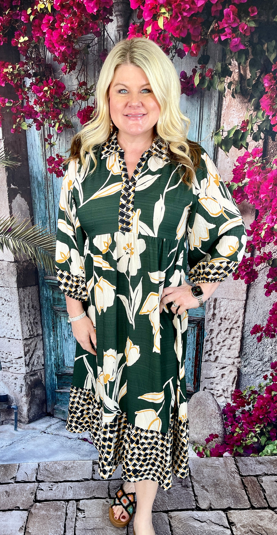 The All the Things Dress is the ultimate mix of charm and comfort. This flower border print collared midi dress features a flattering silhouette and an effortless flow, making it perfect for both casual outings and special occasions. Lightweight and breathable with no lining, it’s easy to wear and style.