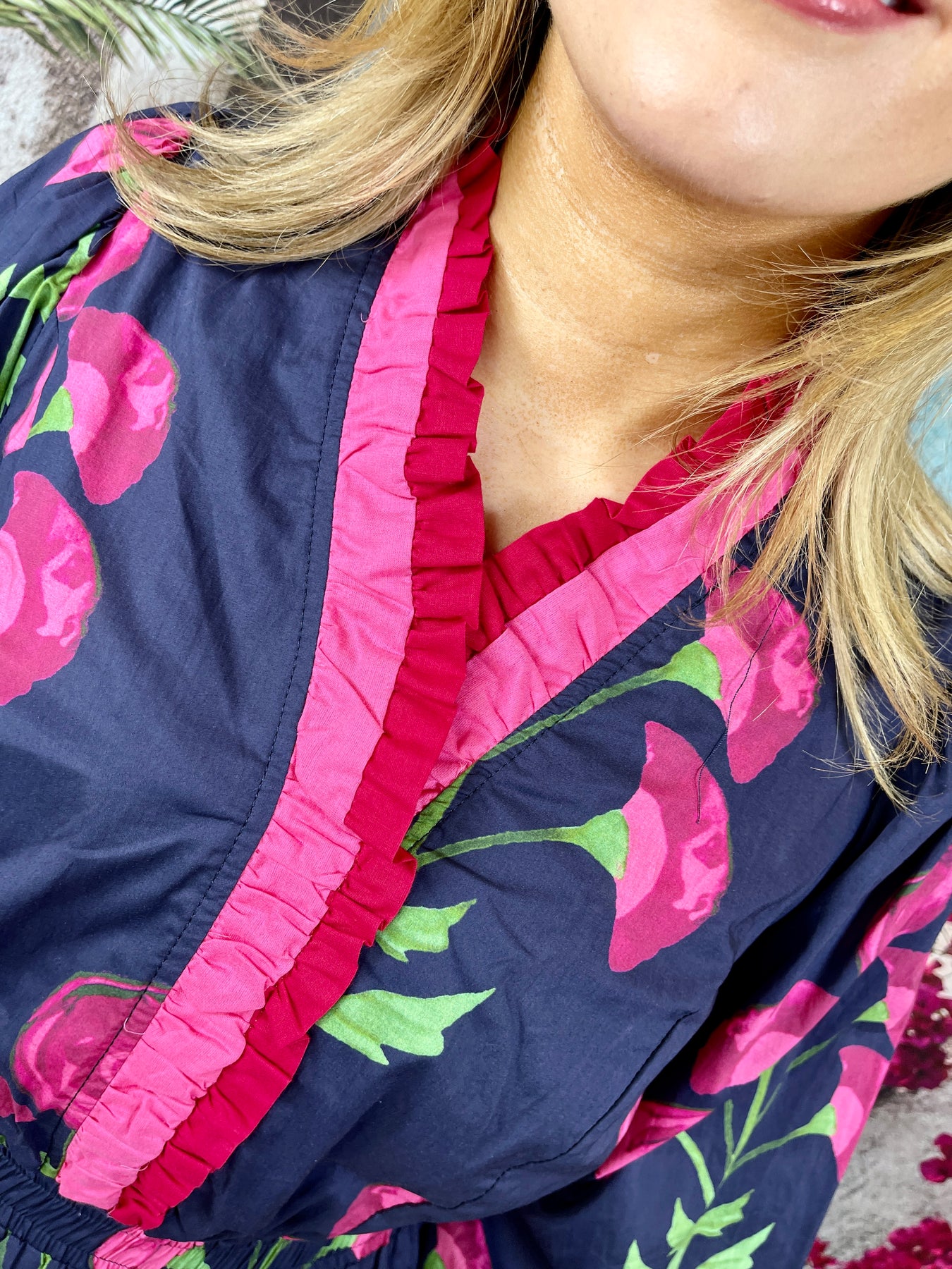 Feminine and flowy, the Radiant Rose Dress is a beautiful statement piece with timeless charm. This navy-blue midi dress features pink floral prints throughout, accented by a collared neckline and a delicate V-neck trimmed with light and dark pink ruffles. The scrunched waist creates a flattering silhouette, while elastic sleeve hems and a ruffled bottom hem add soft movement and romance.