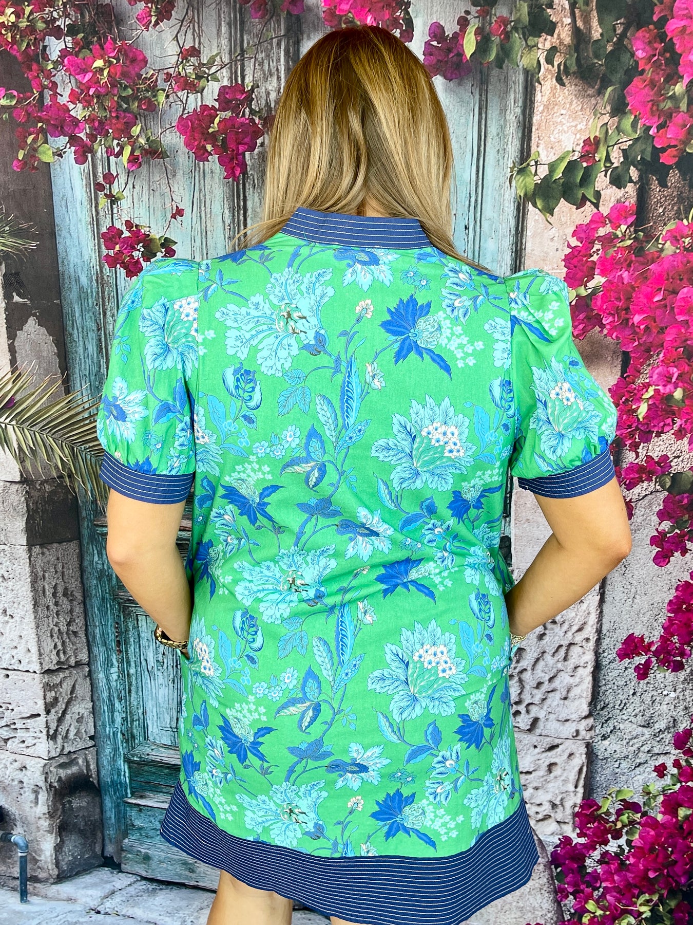 Preppy, charming, and beautifully detailed—the Piper Dress in Green is a delightful short puff sleeve dress that brings garden-inspired style to your wardrobe! This gorgeous dress features a lovely green and blue floral print throughout, creating a fresh, cheerful pattern that's perfect for any season. The collar, flattering V-neckline, sleeve hems, and bottom hem of the dress are all beautifully accented with a coordinating thick navy blue and thin white striped band, adding a preppy, polished detail that ties the whole look together. The short puff sleeves add a feminine, vintage-inspired touch that completes the silhouette. Plus, it has pockets for that perfect blend of style and practicality! Crafted from 100% cotton, this dress is breathable, comfortable, and perfect for all-day wear. Pair it with sandals for a casual daytime look or dress it up with heels and jewelry for brunch, events, or special occasions!