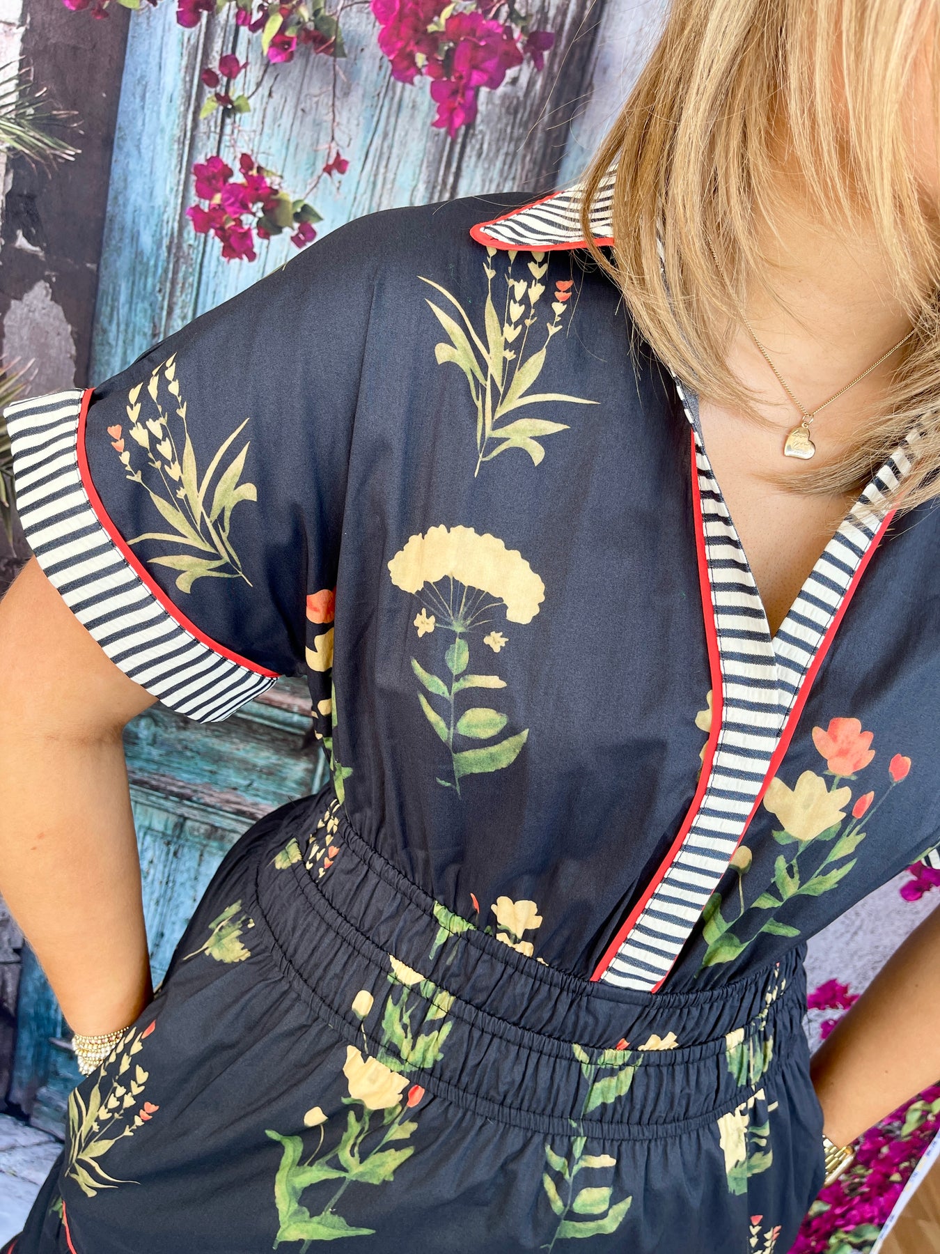Elegant, sophisticated, and beautifully detailed—the Pretty Lady Walking Down the Street Dress in Black is a stunning maxi short sleeve dress that brings timeless style to your wardrobe! This gorgeous dress features a classic black base adorned with a delicate floral print throughout, creating a soft, romantic pattern that's perfect for any season. The waistline showcases a flattering scrunched-up look that creates definition and a feminine silhouette. The collar, flattering V-neckline, and sleeve hems are all beautifully accented with a coordinating black and white striped band, adding a preppy, polished detail that sets this piece apart. Plus, it has pockets for that perfect blend of style and practicality! The flowing maxi length creates an elegant, elongating silhouette. Crafted from 100% cotton with quality contrast details and fully lined for coverage, this dress is breathable, comfortable, and perfect for all-day wear. Pair it with sandals for a casual look or dress it up with heels and jewelry for weddings, events, or special occasions!