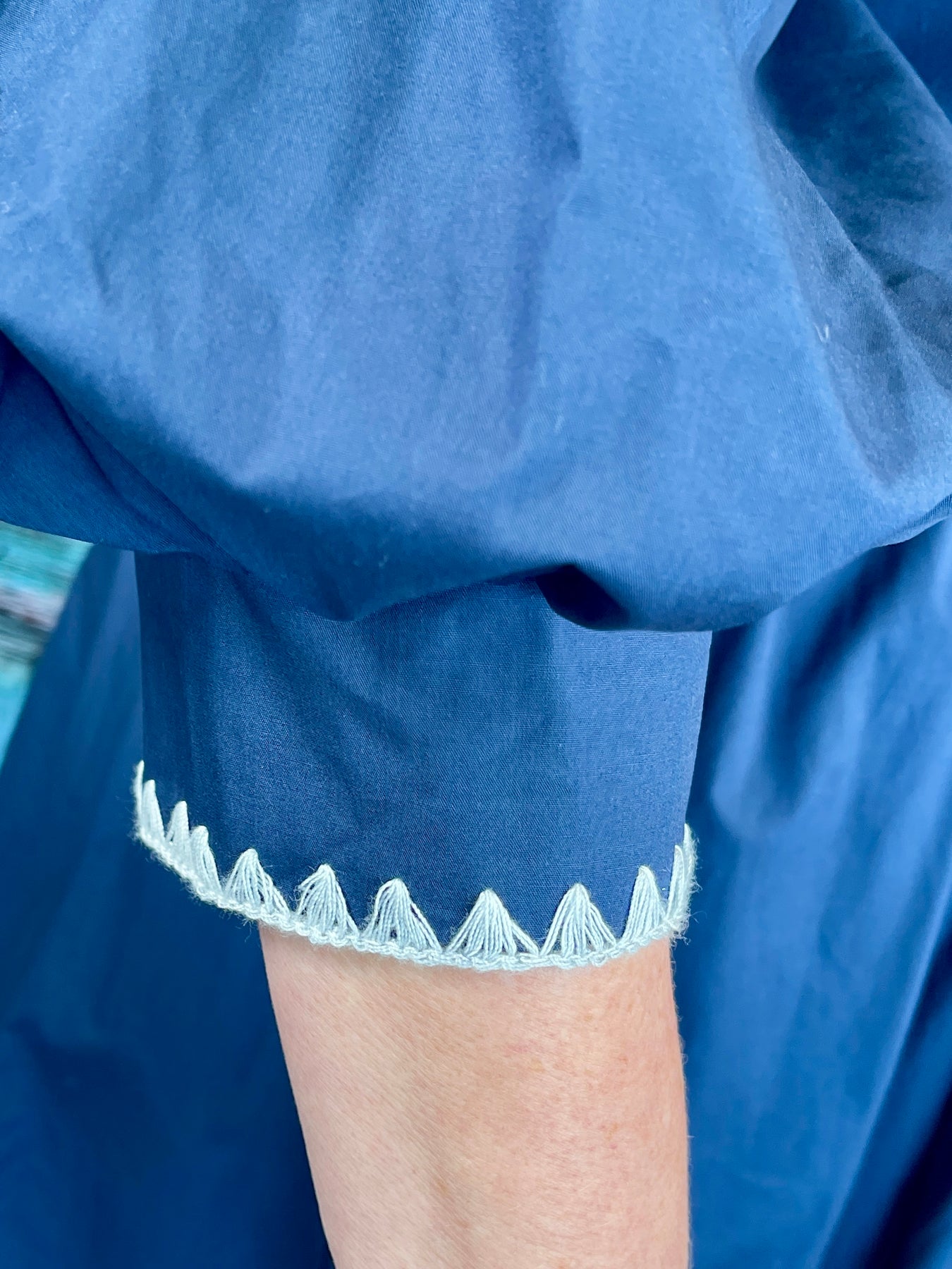 • Long puff sleeves with matching triangle pattern at hems