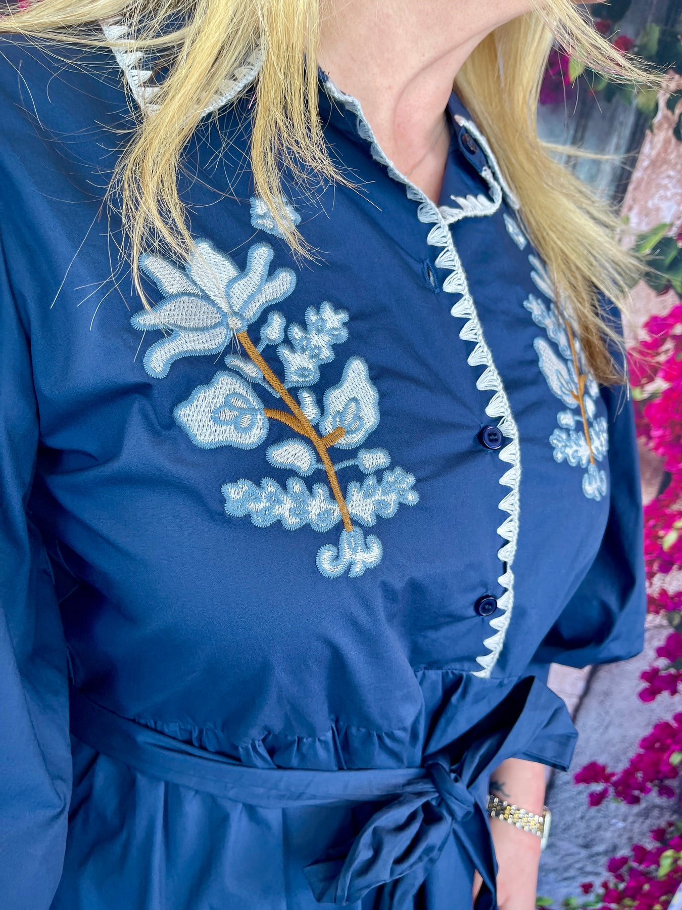 Southern charm meets sophisticated style in the Sissy Down South Dress in Navy—a stunning long puff sleeve dress that brings timeless elegance to your wardrobe! This beautiful navy-blue dress features two delicate flowers adorning the top, creating a sweet, feminine focal point. The polished collar is beautifully outlined with a white triangle line pattern that adds a unique, eye-catching detail, while the same striking pattern frames the sleeve hems for a cohesive, designer-inspired look. The long puff sleeves add a romantic, vintage-inspired silhouette, and a charming tie at the front creates a flattering, adjustable fit. Crafted from 100% cotton and fully lined for comfort and coverage, this dress is perfect for special occasions, garden parties, or any event where you want to look effortlessly elegant!