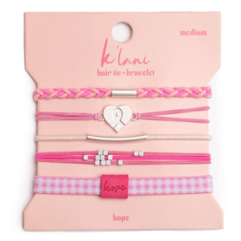 K'Lani's Hope collection features five hair tie bracelets in soothing shades of pink. Each one has a delicate silver heart charm adorned with a breast cancer ribbon, symbolizing our commitment to the cause. A portion of the proceeds from each purchase will be donated to the Susan G. Komen foundation.
