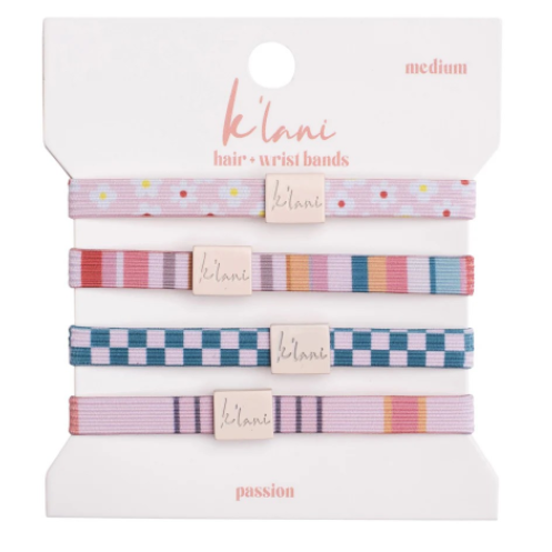 K'Lani's set of Passion Hair Tie/Bracelet will jazz up your hair game with its four versatile hair + wristbands. These bands embrace all hair types effortlessly, while featuring fun patterns like checkers, flowers, and stripes in a vibrant, trendy color palette. Let these bands be your daily reminder to live with passion!