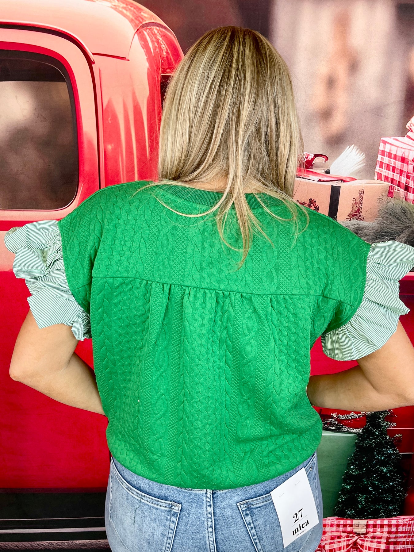 The Surprise I’m Your Gift Top in green is the ultimate festive statement piece! This short sleeve knit top features a thick green band along the neckline and bottom hem for a polished finish. The sleeves steal the show with green and white striped ruffles, while a large matching striped bow on the front adds the perfect playful, holiday-ready touch.