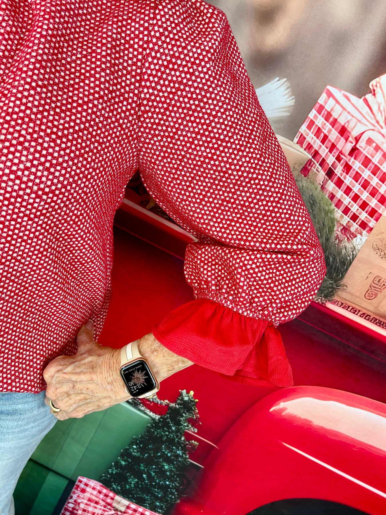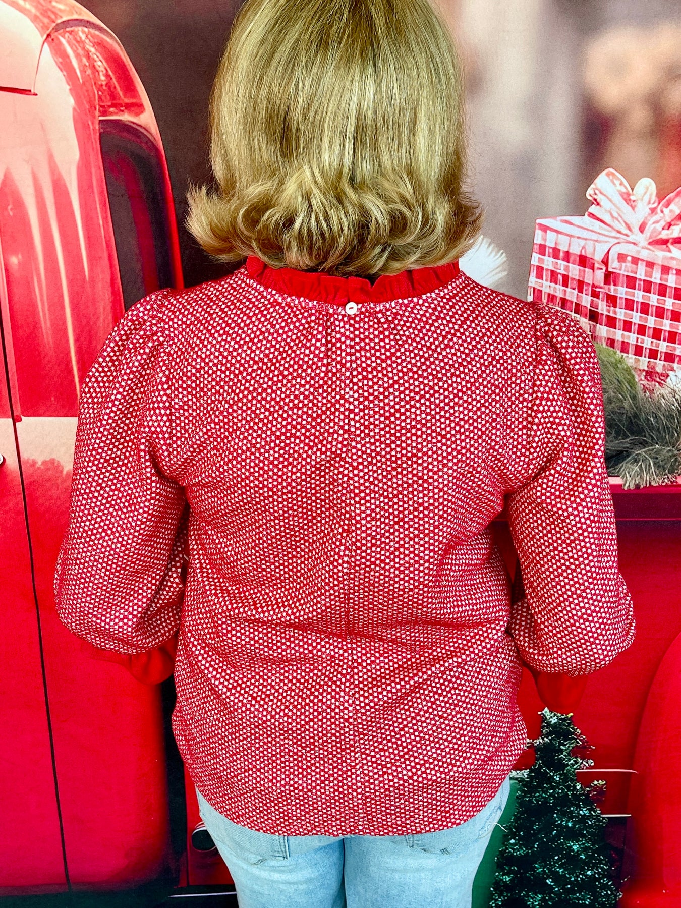 The Sparkle Queen Top is a bold and festive long sleeve red top sprinkled with white sparkly specks all over, giving it a shimmering, eye-catching look. The sleeves feature a soft puff detail, adding a feminine touch, and both the sleeve hems and neckline are finished with a thick red ruffled band for extra charm and dimension.