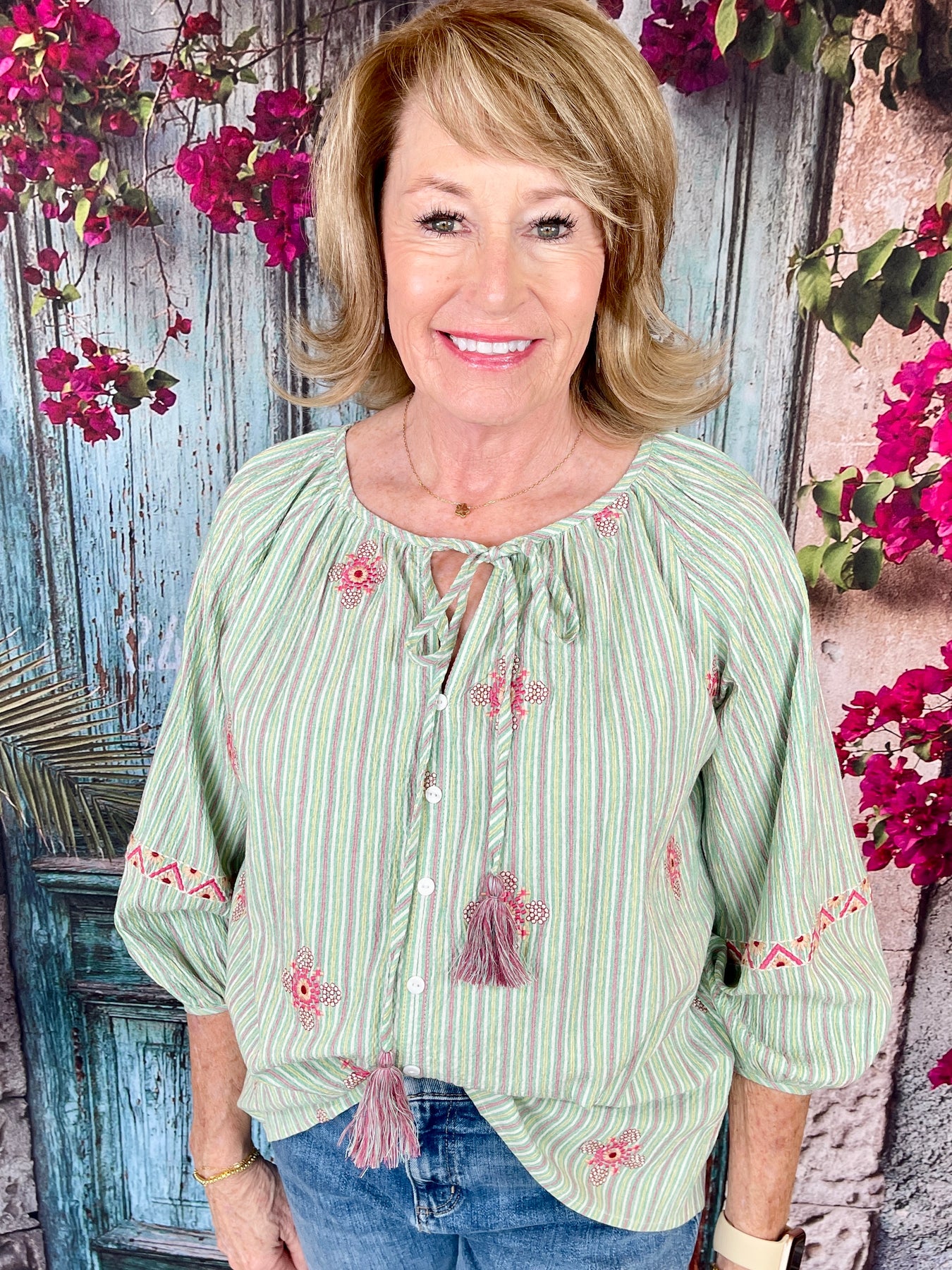 Colorful, charming, and beautifully detailed—the Apple Green Top is a vibrant long sleeve top that brings playful style to your wardrobe! This eye-catching top features a delightful green, pink, white, and yellow striped pattern adorned with little flower designs scattered all over the front, back, and sleeves, creating a whimsical, garden-inspired aesthetic. The lower half of the sleeves showcases a unique abstract band pattern that adds artistic flair and visual interest. The neckline is finished with a charming tie detail, while the button-down front creates a classic, versatile silhouette. Crafted from 100% cotton, this top is breathable, comfortable, and perfect for all-day wear. Pair it with jeans for a casual chic look or tuck it into a skirt for a more polished ensemble that's full of personality!