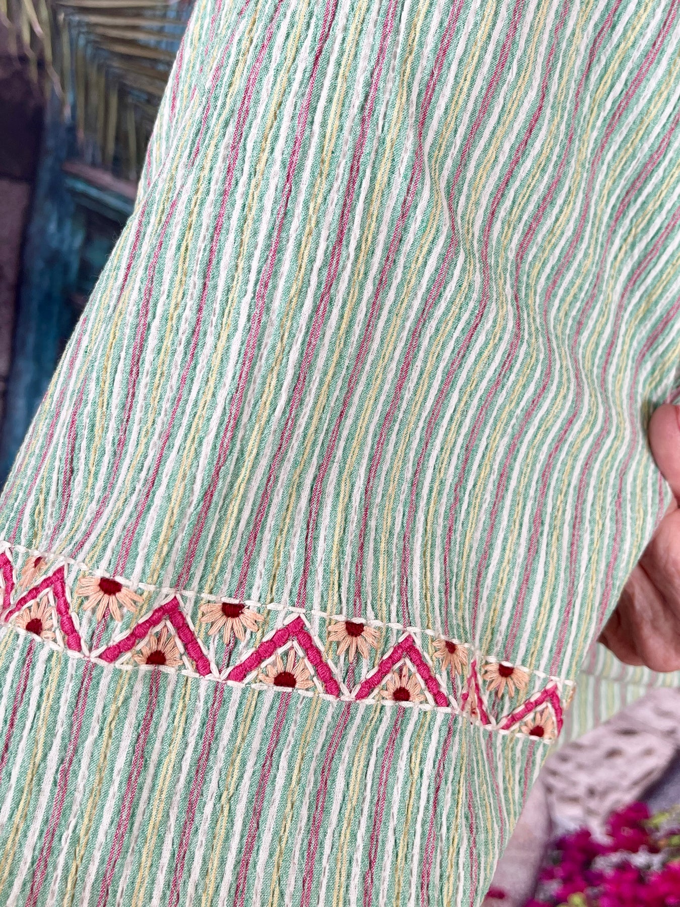 • Green, pink, white, and yellow striped pattern