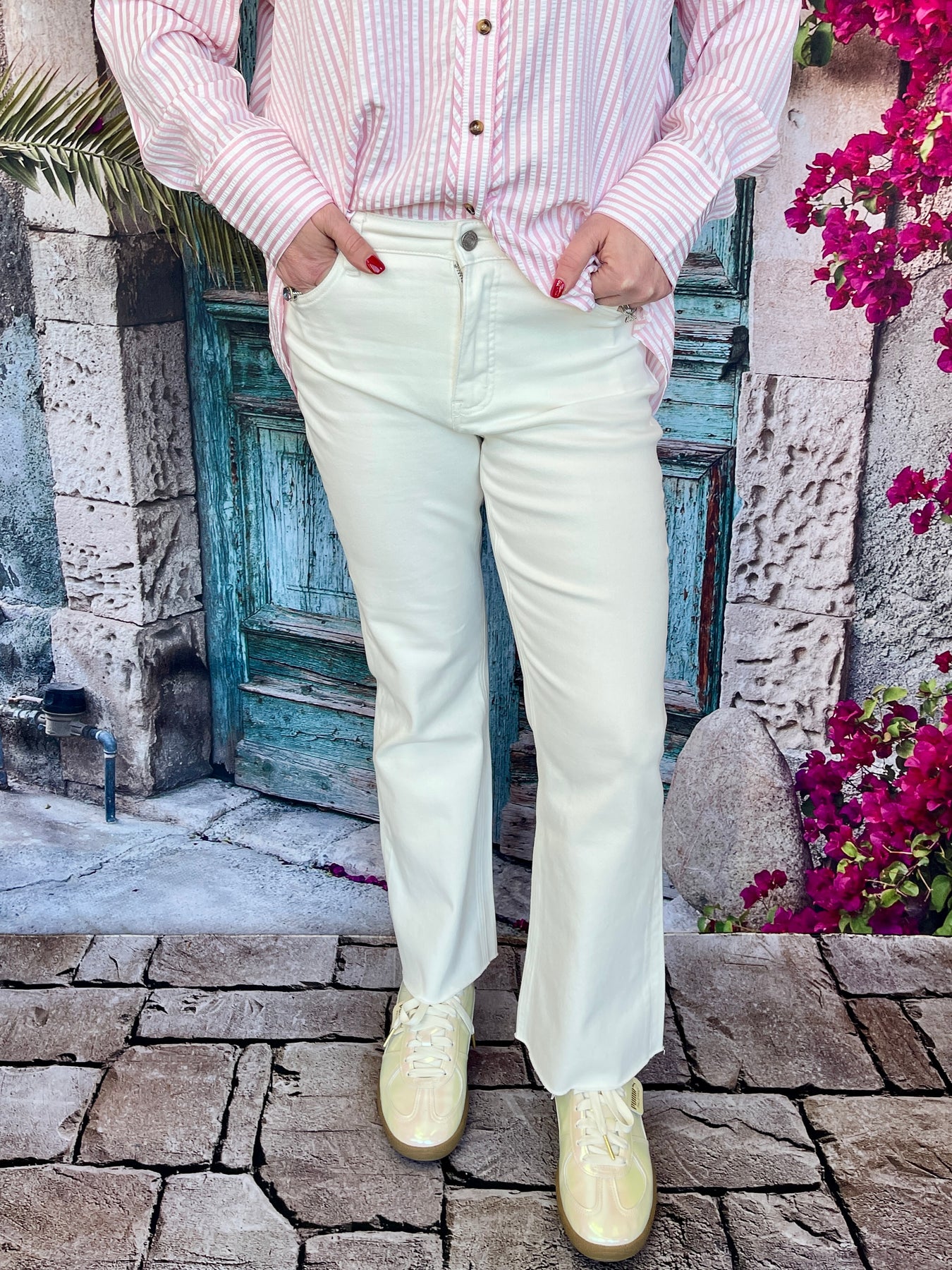 Flattering, versatile, and effortlessly chic—the Bayeas Emily Mid Rise Raw Hem Bootcut Denim in White is a stunning pair of white pants that brings fresh, modern style to your wardrobe! These gorgeous pants feature a mid-rise design that sits comfortably at the hips, creating a flattering fit that's universally appealing. The bootcut leg silhouette offers a sleek cut that sculpts the legs beautifully, highlighting feminine body curves while concealing any figure flaws. The raw hem adds a trendy, undone detail that gives these pants a contemporary edge. Suitable for various occasions, these white pants are incredibly versatile—dress them up or down with ease! Crafted from premium denim with just the right amount of stretch, these pants offer all-day comfort without sacrificing structure. Pair them with a tucked-in blouse and heels for a polished look or keep it casual with a tee and sneakers for effortless everyday style!