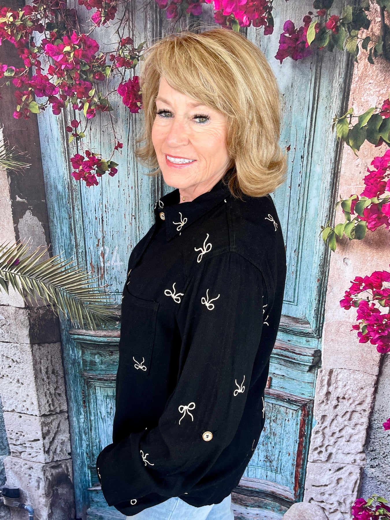 The Too Cute in My Bows Top is a breathable long sleeve black top detailed with tiny gold bows scattered throughout, adding the perfect touch of sparkle and charm. It features a front pocket, a classic collared neckline, and white buttons outlined in gold that trail down the front for a polished, elevated finish.