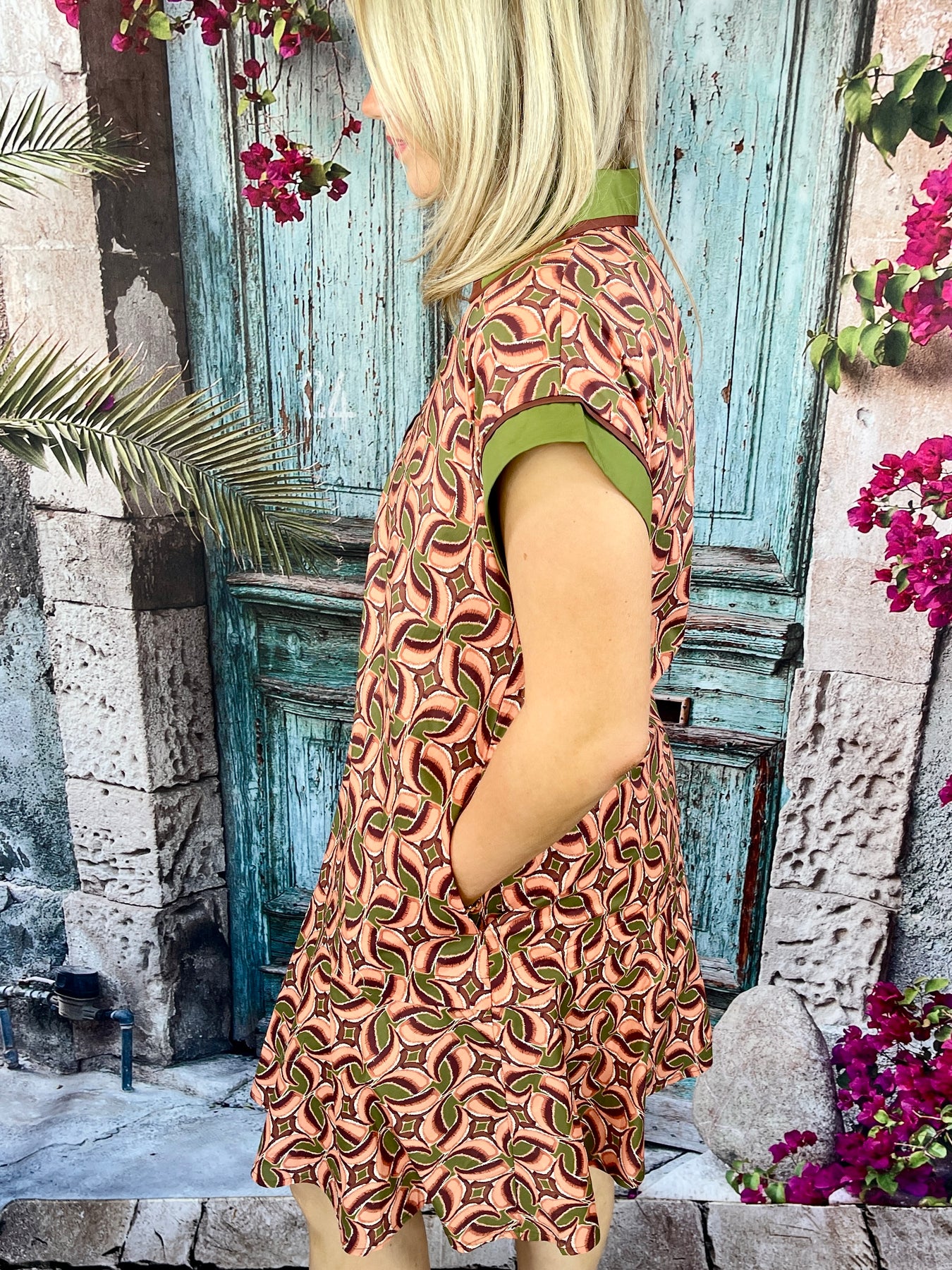 The Throw On and Go Dress in terra cotta brings an easy, stylish charm to your wardrobe. This short mock sleeve dress features a unique abstract pattern throughout, paired with a collared neckline and V-neck detailed with green and brown stripes. The mock sleeves add a playful touch with their thick green band and thin brown accent for a beautifully balanced look.