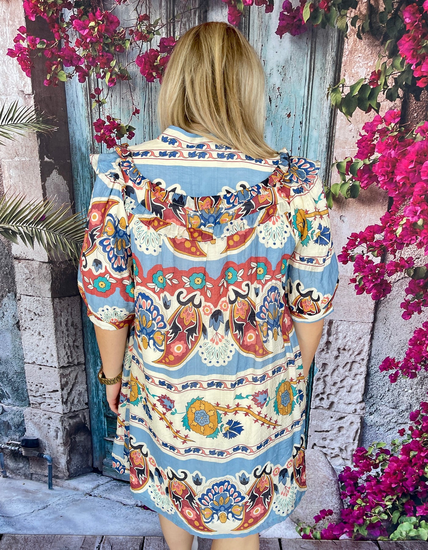 Fun, flirty, and full of charm—the Blue Mix & Mingle Dress is ready for any outing! This lightweight border print mini features playful ruffle detailing throughout, giving it a breezy, feminine feel. Designed without lining for an airy drape, it’s perfect for warmer days or layering with a denim jacket into fall.