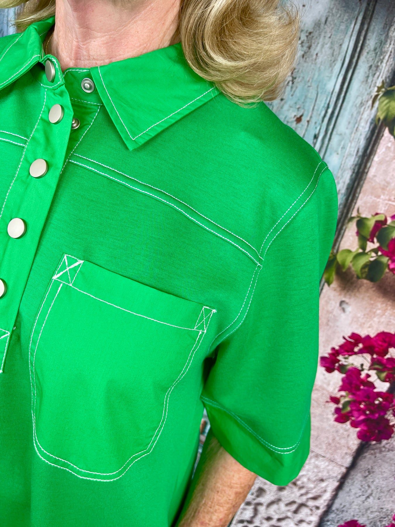 Casual, versatile, and beautifully detailed, the Out & About Dress is a chic short sleeve green dress that brings effortless, everyday style to your wardrobe! This gorgeous dress features a lovely green color that's fresh and easy to style, perfect for any season or occasion. The polished collar adds a refined touch, while five buttons going down the top half of the dress create classic, shirt-dress inspired detailing. A functional pocket on the front of the dress adds both practicality and visual interest, and the dress also has side pockets for that perfect blend of style and convenience! The short sleeves make this dress perfect for warm weather and easy layering. Crafted from a comfortable polyester-rayon-spandex blend with stretch and quality contrast details, this dress moves with you and feels amazing to wear. Pair it with sandals for a casual daytime look or dress it up with heels and jewelry for brunch, events, or special occasions!
