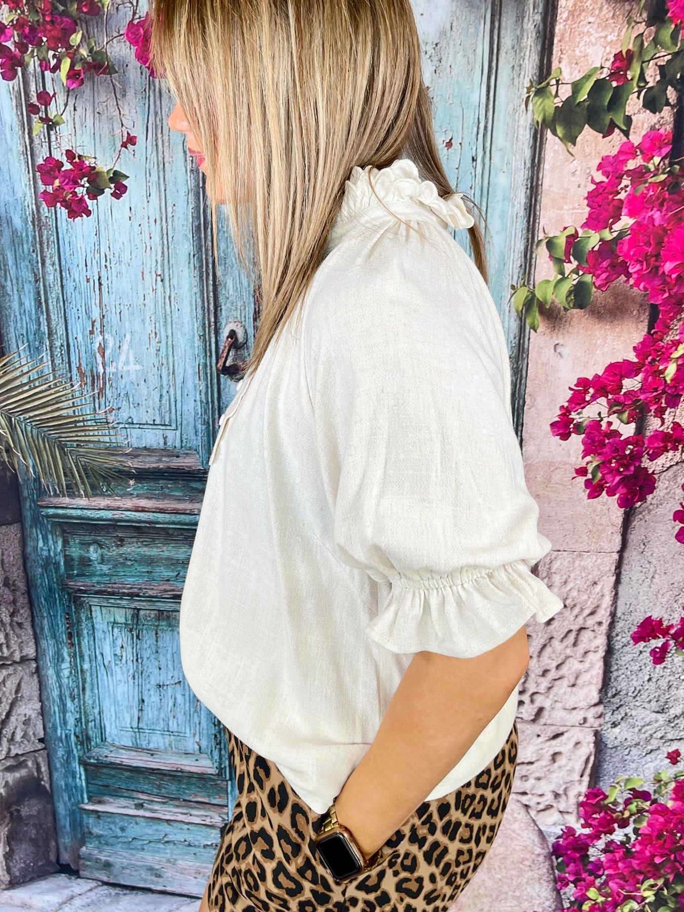 Romantic, charming, and beautifully detailed, the Ruffle and Scallop Please Top is a delightful short puff sleeve cream-colored top that brings feminine elegance to your wardrobe! This gorgeous top feature a lovely cream hue that's soft and versatile, perfect for any season or occasion. The flattering scalloped V-neckline adds a unique, vintage-inspired detail that creates a beautiful focal point, while the charming ruffle collar frames the neckline with playful, romantic flair. The short puff sleeves are finished with coordinating ruffles at the hems, adding a sweet, feminine touch that completes the look. Crafted from a premium linen-cotton blend, this top is breathable, comfortable, and perfect for warm weather with a relaxed, lived-in feel. Pair it with jeans for a casual chic look or tuck it into a skirt for a more polished ensemble that's perfect for brunch or special occasions!