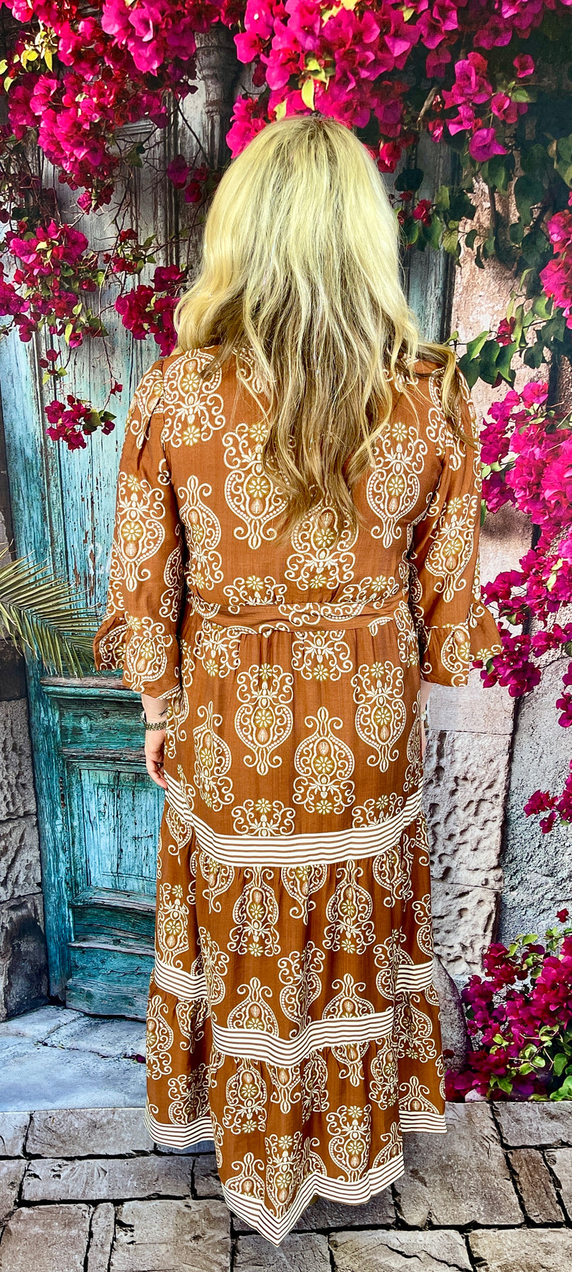 The Cinnamon Kaleidoscope Dress is a stunning statement piece with a warm, autumn-inspired color palette and intricate details. Designed with 3/4 ruffled bell sleeves and a tiered maxi silhouette, this woven print dress flows beautifully with every step. The contrast detailing adds texture and visual interest, while hidden pockets bring function to its elegant form.