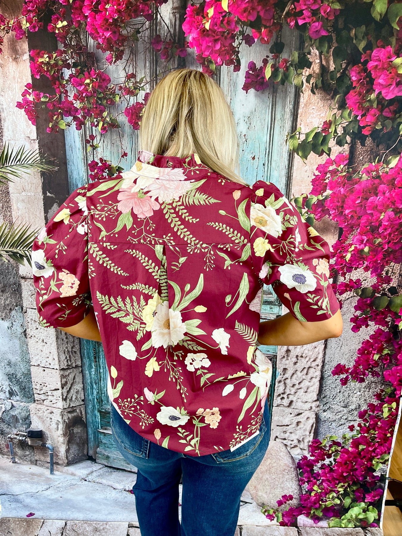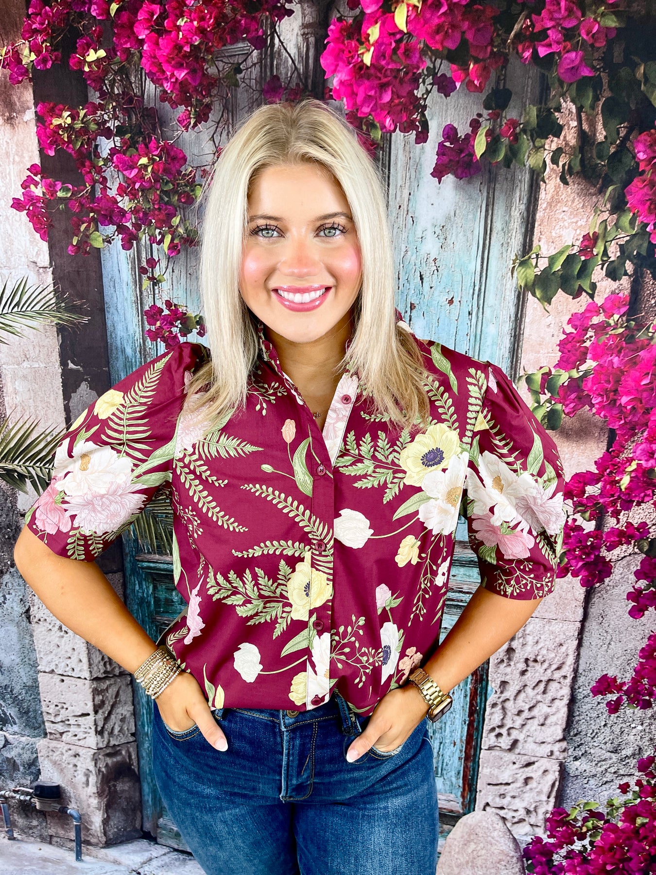 Polished for the office yet playful enough for after hours—the From Work To Play Top does it all! This merlot floral blouse features a ruffled neck with button-front closure and pleated short puff sleeves for a flattering, feminine touch. Crafted in lightweight 100% cotton, it’s breathable, stylish, and easy to wear anywhere the day takes you.