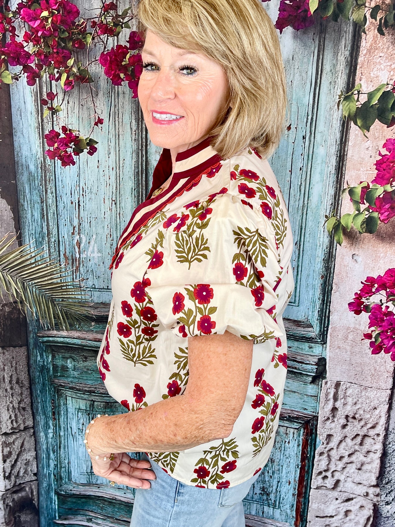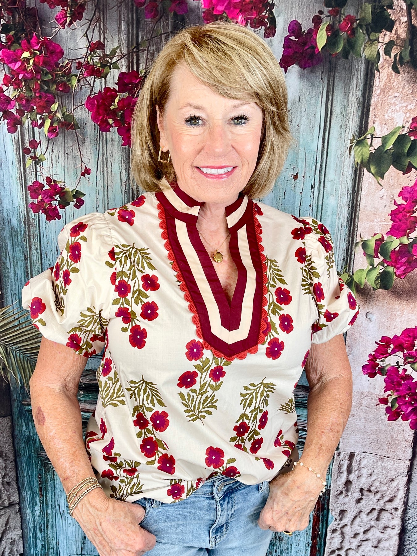 Stand out in the Anything But Basic Top, a not-so-simple statement piece with rich colors and beautiful detailing. This short puff sleeve cream top is adorned with red and purple florals, creating a soft yet vibrant look. The neckline and v-neck feature a thick striped band in burgundy and light tan, while a burnt orange scalloped trim outlines the v-neck for an extra pop of contrast and texture.