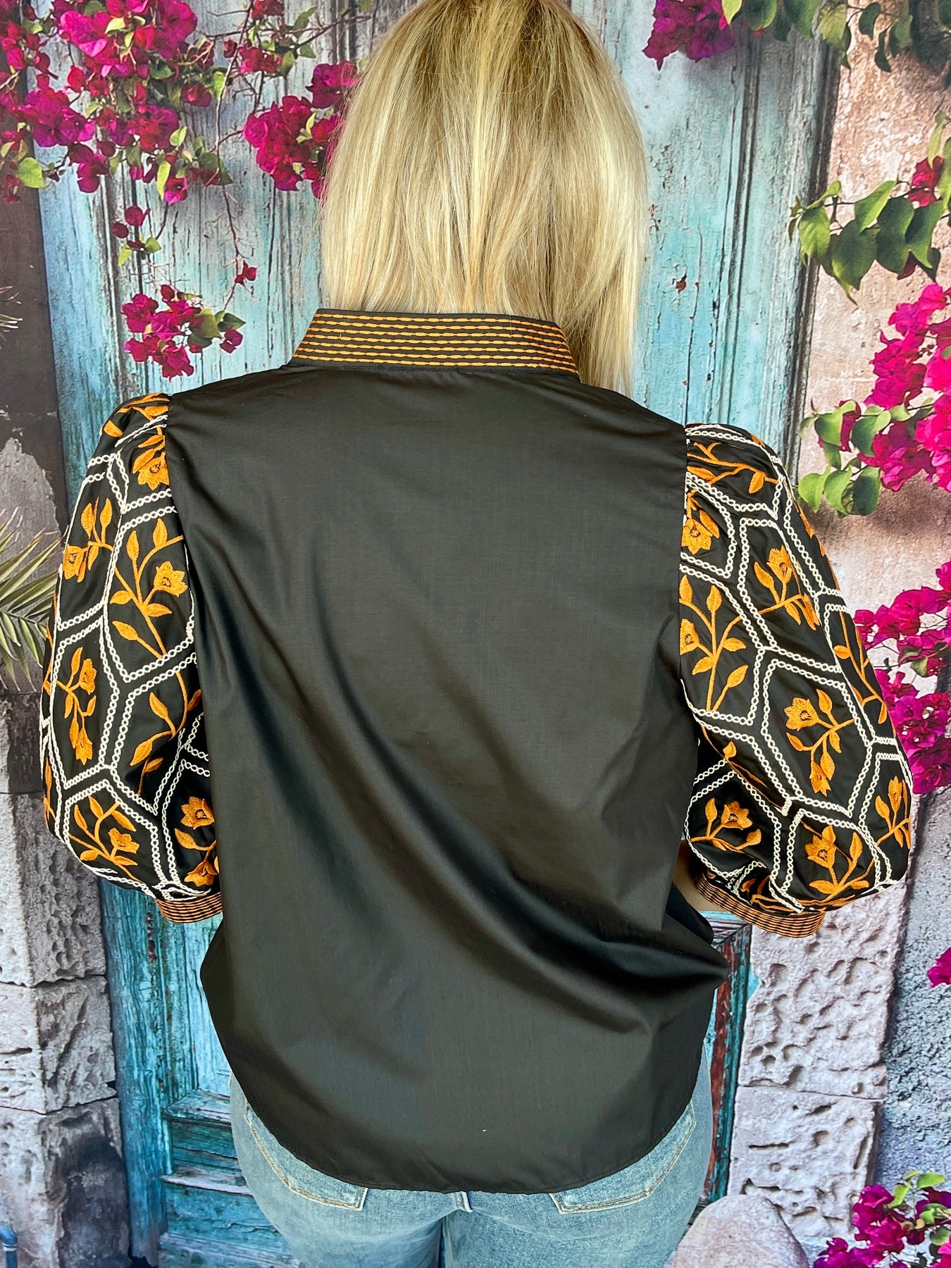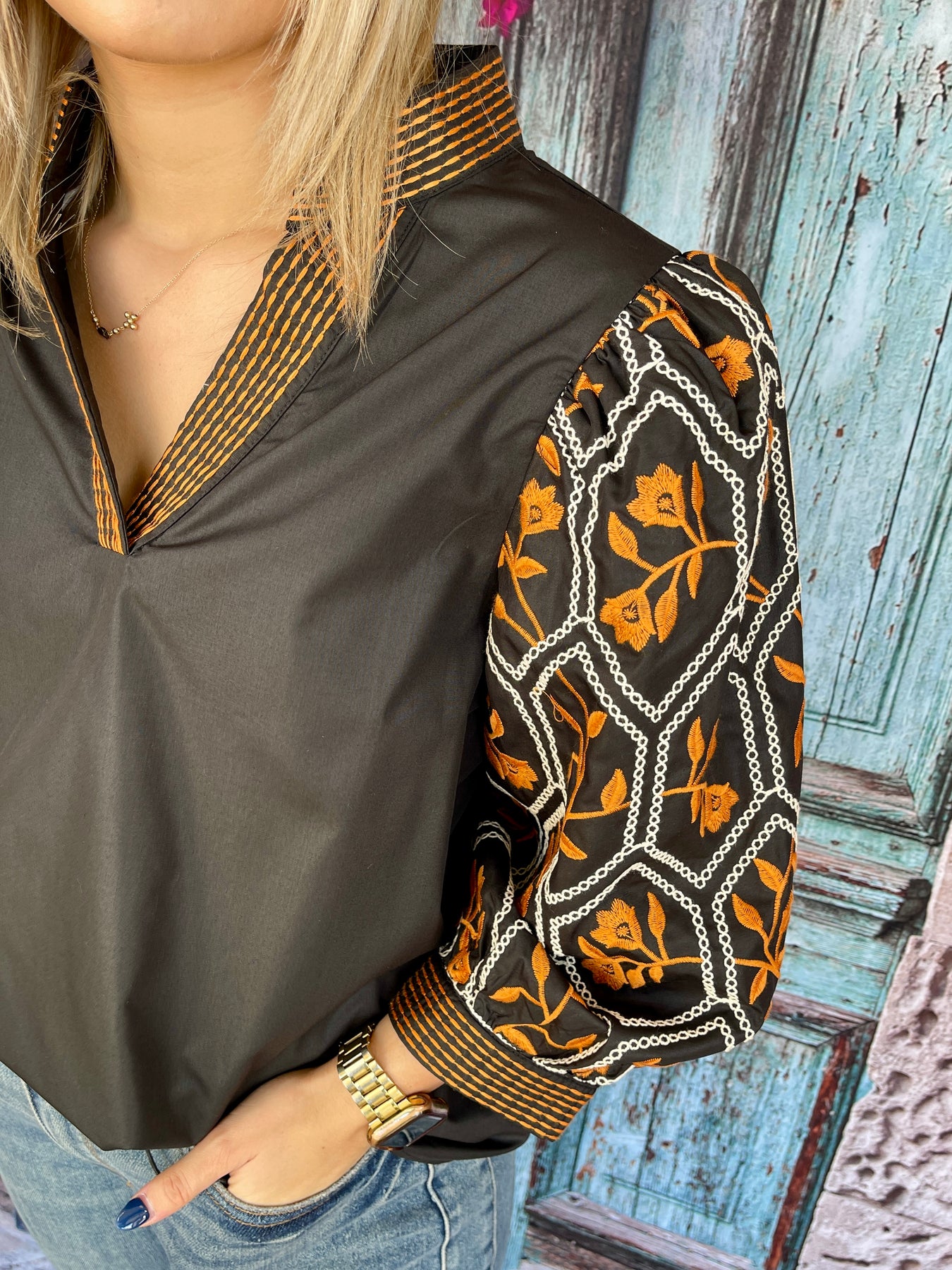 A little boho, a little bold—the Dusty Rose Top in Black is a true standout! This solid black blouse features beautiful orange and off-white embroidery along the sleeves and accenting the V-neckline for just the right pop of detail. Lightweight and easy to wear, it’s perfect for game days, weekends, or adding a touch of charm to your everyday look.