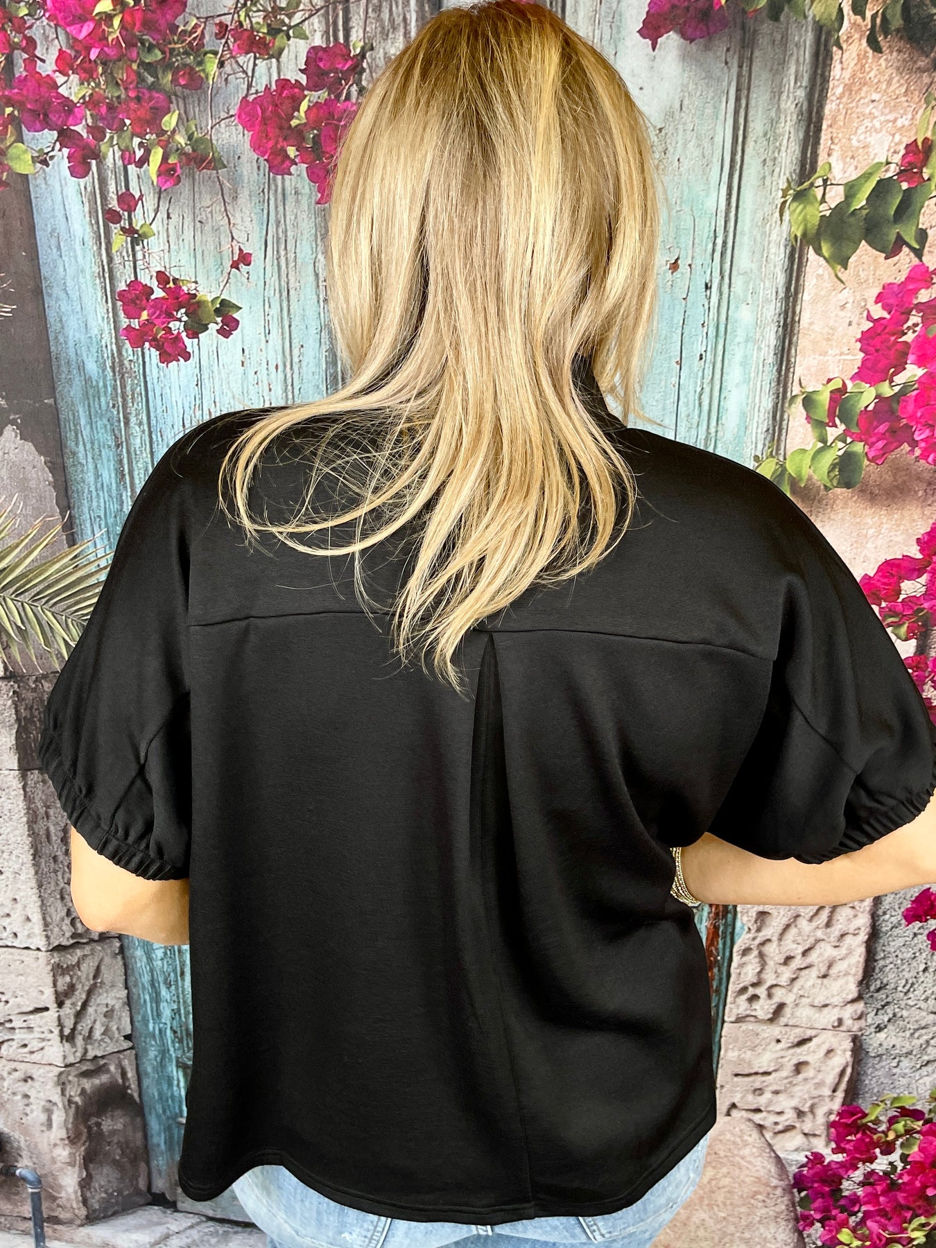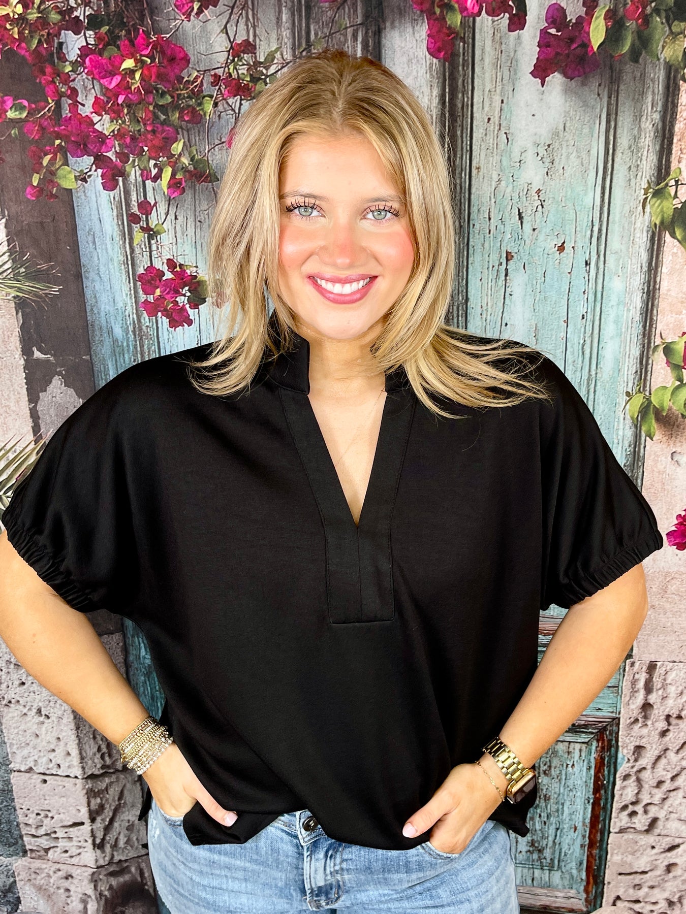 Simple, flattering, and effortlessly wearable — the Don’t Ever Change Top is a must-have staple with elevated details. This soft and breathable black top feature mock sleeves and a thick black band along the collar and V-neck for a clean, polished look. The elastic-style sleeve hems add subtle shape and comfort, making it perfect for all-day wear.
