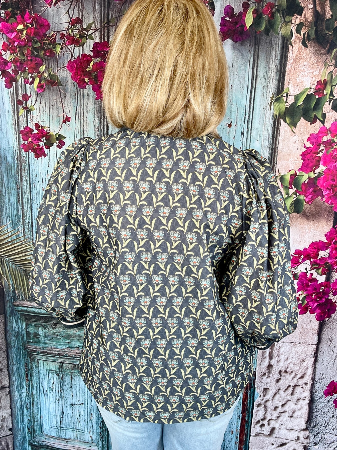 The La La Lori Top in midnight brings a playful mix of color and comfort. This long sleeve cotton top features a blue and green floral abstract print all over, complete with a front zipper for a touch of sporty charm. The blue and white collar and striped sleeve hems add the perfect finishing details.