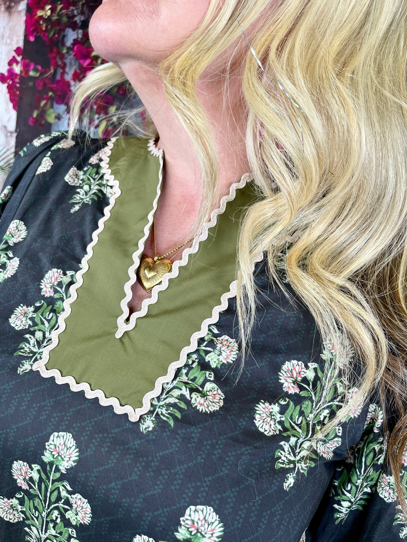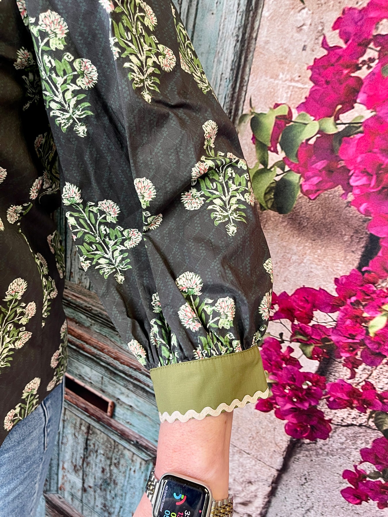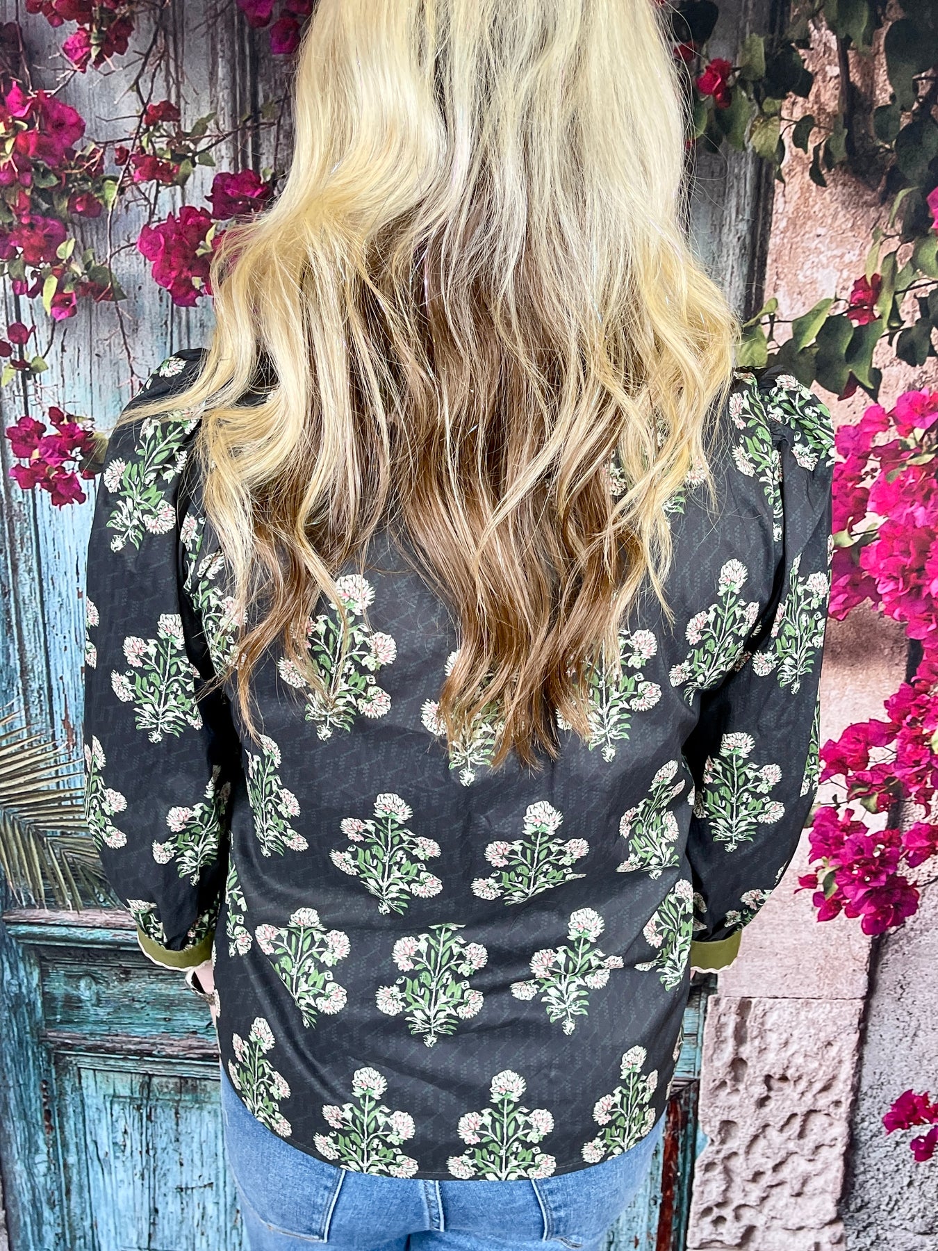 Bold, detailed, and beautifully vibrant, the Hey Ma Top adds a playful pop of color to your everyday style. This long sleeve black top features a lively allover floral print paired with subtle puff sleeves for a feminine touch. The design is elevated with thick green contrast bands at the sleeve hems, neckline, and V-neck—each trimmed with a delicate white wavy stripe that brings the whole look together.