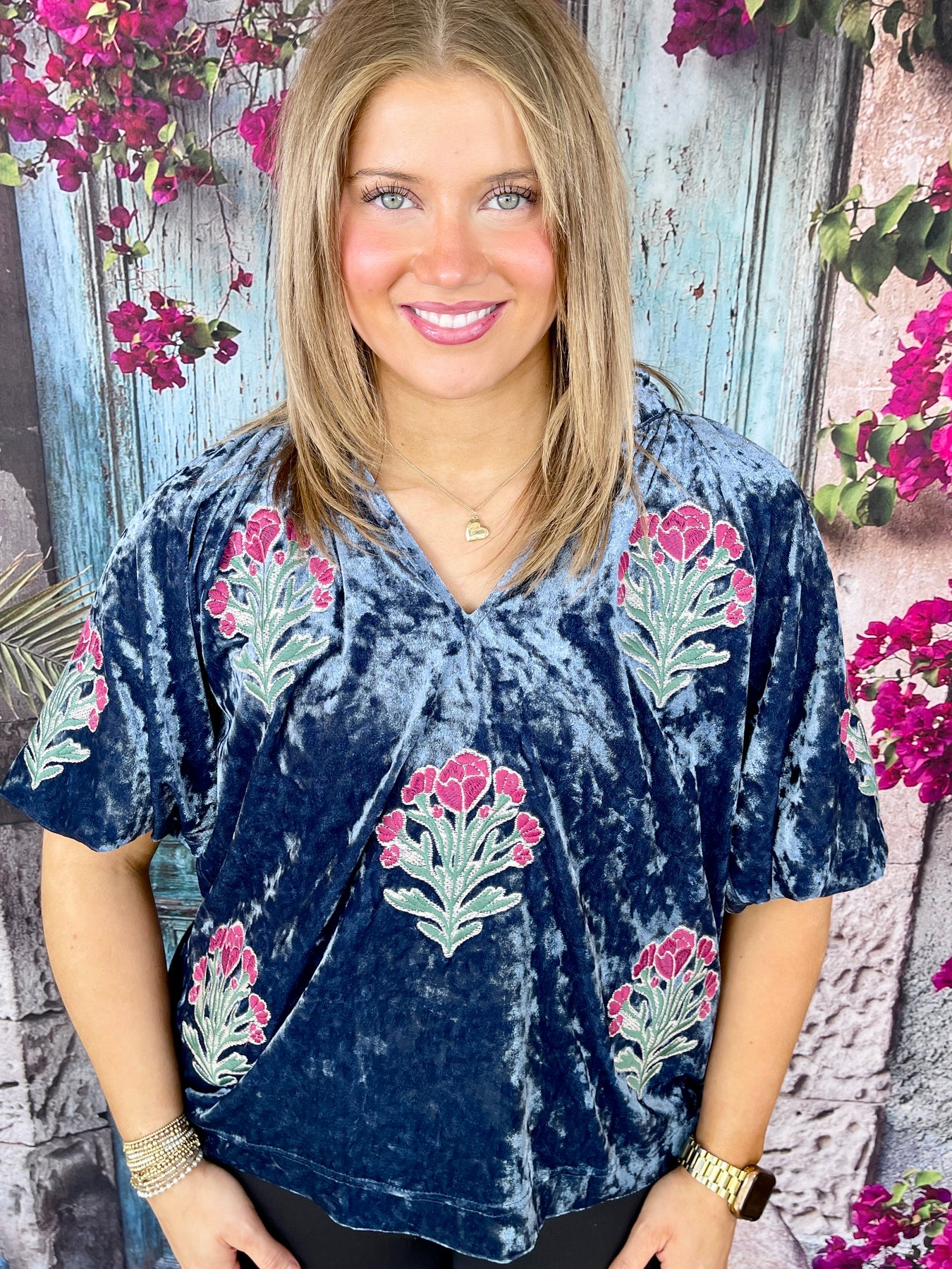 Luxurious, romantic, and beautifully detailed—the Velvety and Such Top is a stunning short sleeve navy blue velvet top that brings elegant charm to your wardrobe! This gorgeous top feature a rich navy blue velvet fabric that feels incredibly soft and looks absolutely luxe. The entire top is adorned with delicate pink and green florals that create a beautiful, garden-inspired pattern against the sumptuous velvet base. The flattering V-neckline is framed by a charming, scalloped collar that adds a vintage-inspired, feminine detail that sets this piece apart. Crafted from a comfortable polyester-spandex blend with stretch and fully lined for coverage, this top is perfect for special occasions or anytime you want to feel extra elegant. Pair it with jeans and heels for a dressed-up casual look or tuck it into a skirt for a polished ensemble that's perfect for date nights or events!