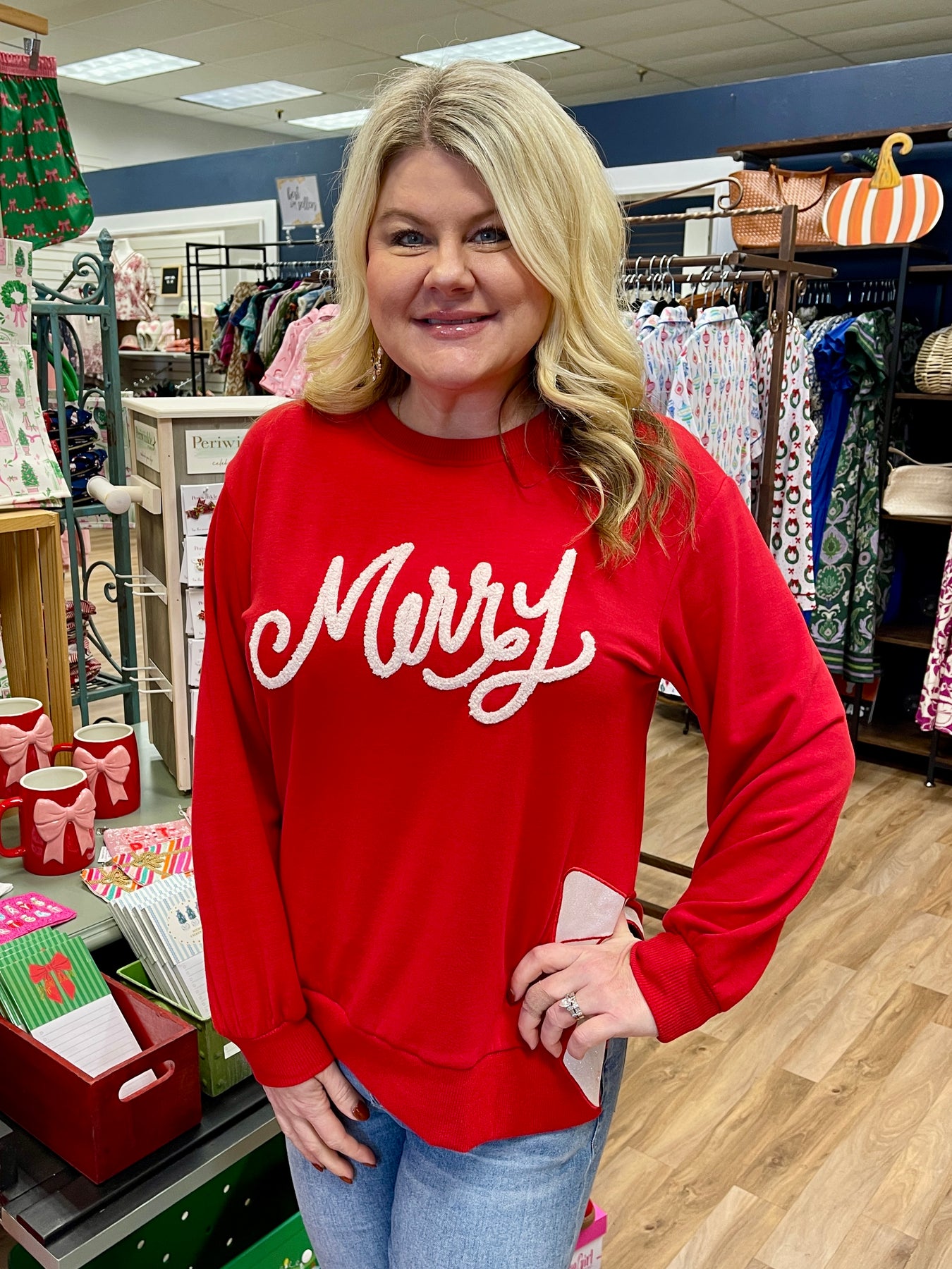 Stay festive and cozy in the Lakelyn Sweatshirt – Merry Bow! This long sleeve red sweatshirt features the word “merry” in crisp white lettering across the front. On each bottom side, there’s a white glittery bow accenting a small side slit — adding just the right touch of sparkle and charm to your holiday look.