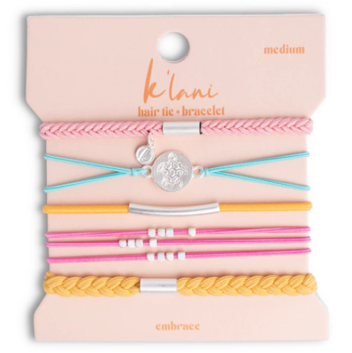 The EMBRACE set by K'Lani features five bracelets that also function as hair ties, showcasing a beloved Hawaiian Honu charm with silver and white metal accents in vibrant colors. This colorful set encourages wearers to not only hold their loved ones close, but to also embrace themselves for who they truly are.