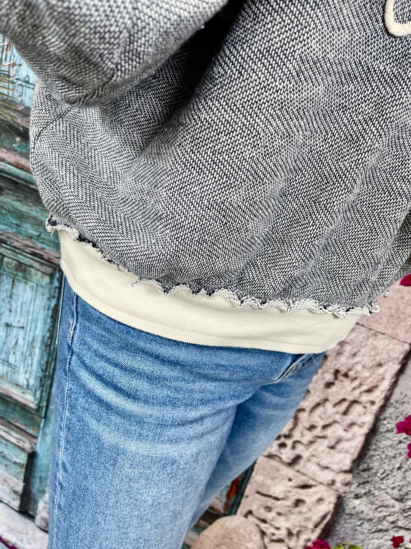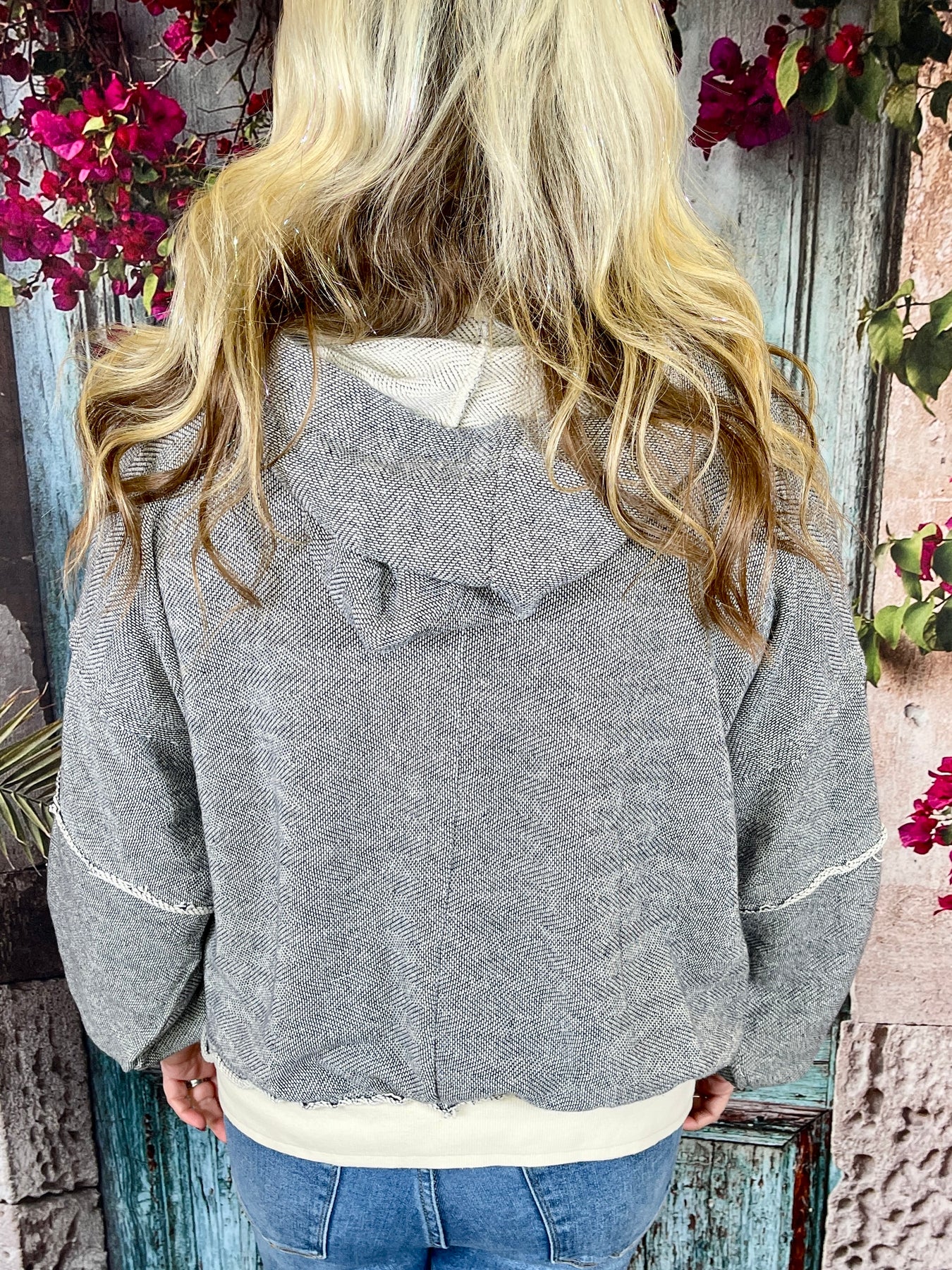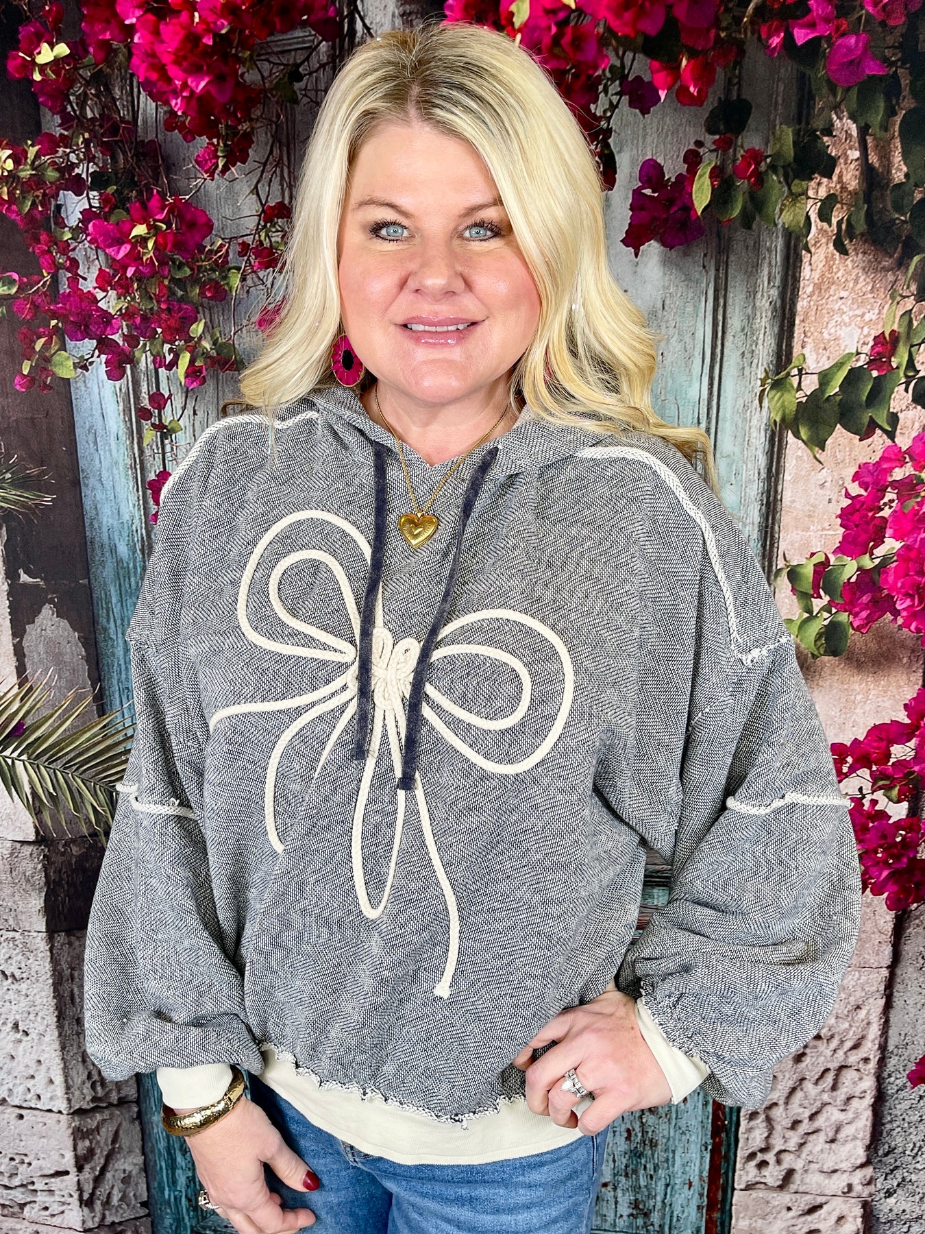 Cozy meets cool in the Just Let Me Be Top, the perfect laid-back sweater with standout details. This soft, breathable long sleeve sweater top features an inside-out style look for a relaxed, lived-in vibe. A white braided bow on the front adds a sweet contrast, while the thick white bands at the sleeve hems and bottom hem give it a bold, finished touch. Complete with a hoodie, this top is all about comfort with personality.