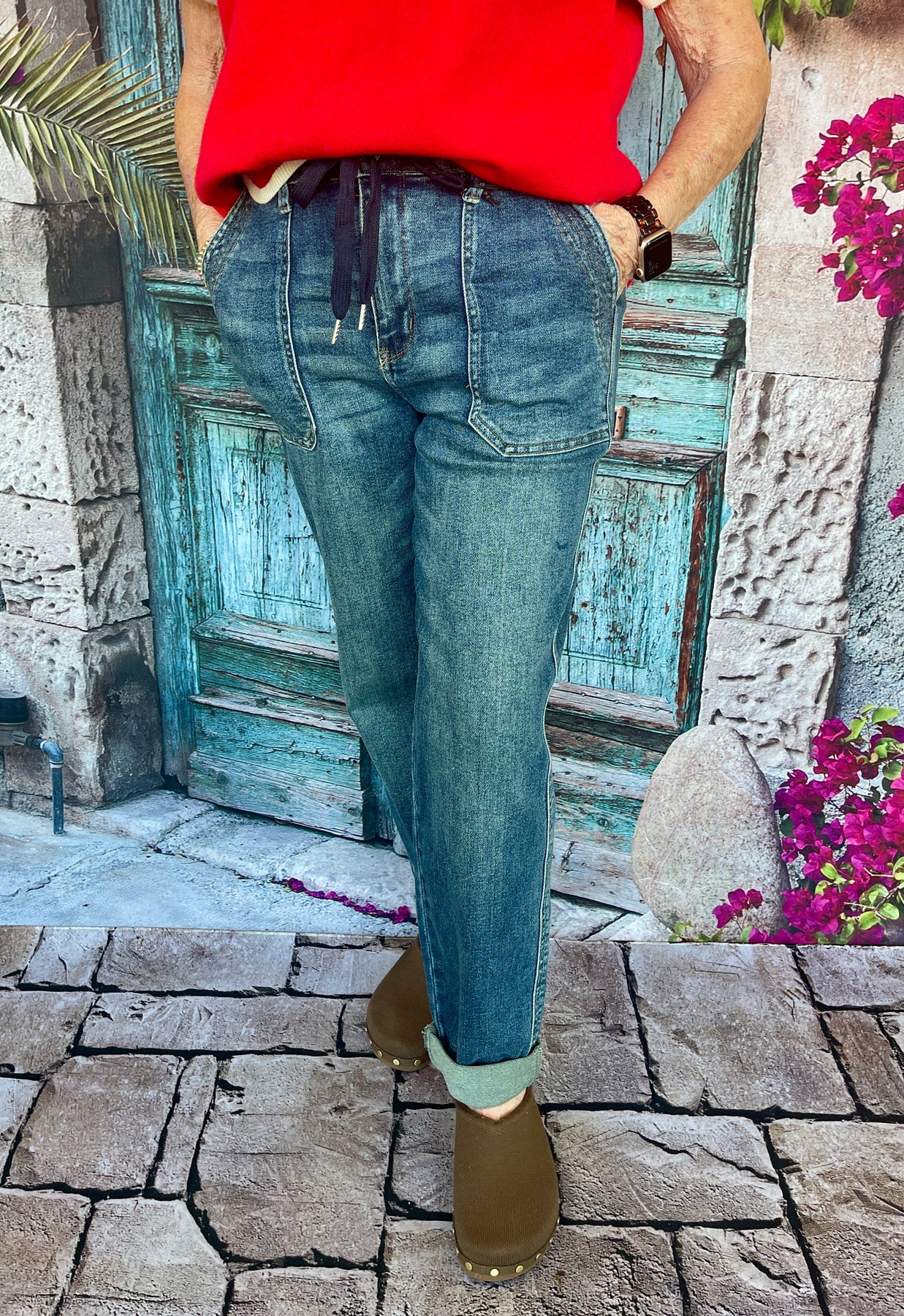 Comfort meets style in the Judy Blue Vintage Wash Jogger, the perfect blend of relaxed fit and elevated denim design! These high-waisted joggers feature a beautifully worn vintage wash that gives them that perfectly lived-in look right out of the box. The flattering high-rise silhouette sits comfortably at the natural waist, while the navy drawstring adds a sporty touch and allows for a customizable fit. With a versatile inseam that can be worn cuffed at 29 1/2" or uncuffed at 31", these joggers offer flexibility for your height and style preference. Pair them with sneakers and a tee for casual weekends or dress them up with heels and a blouse for an effortlessly chic look!